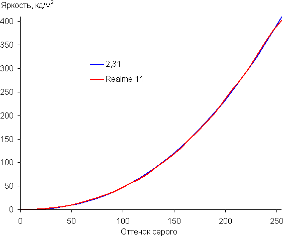 Напомним, что в случае OLED-экранов яркость фрагментов изображения динамично меняется в соответствии с характером выводимого изображения — немного уменьшается для светлых в целом изображений. В итоге полученная зависимость яркости от оттенка (гамма-кривая), скорее всего, не точно соответствует гамма-кривой статичного изображения, так как измерения проводились при последовательном выводе оттенков серого почти на весь экран.