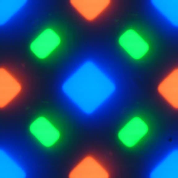 В этом экране используется матрица Super AMOLED — активная матрица на органических светодиодах. Полноцветное изображение создается с помощью субпикселей трех цветов — красного (R), зеленого (G) и синего (B), но красных и синих субпикселей в два раза меньше, что можно обозначить как RGBG. Это подтверждается фрагментом микрофотографии: