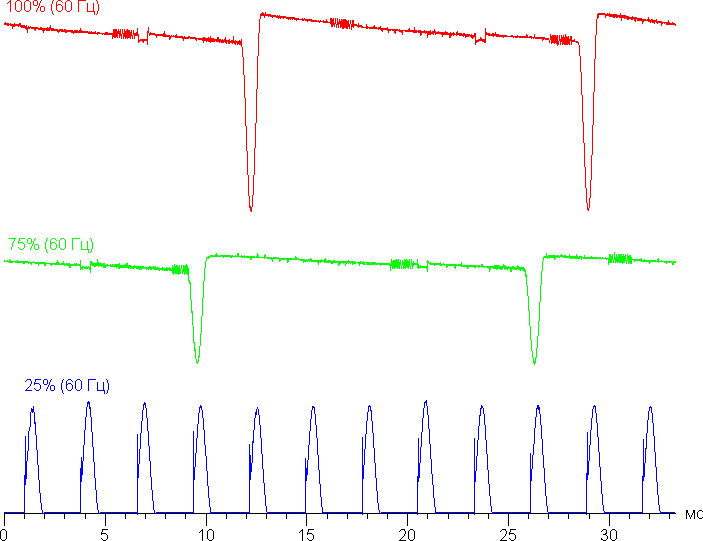 На любом уровне яркости присутствует значимая модуляция с частотой 60, 90 или 360 Гц. На рисунке ниже приведены зависимости яркости (вертикальная ось) от времени (горизонтальная ось) для нескольких значений настройки яркости. Сначала для режима с частотой обновления 60 Гц: