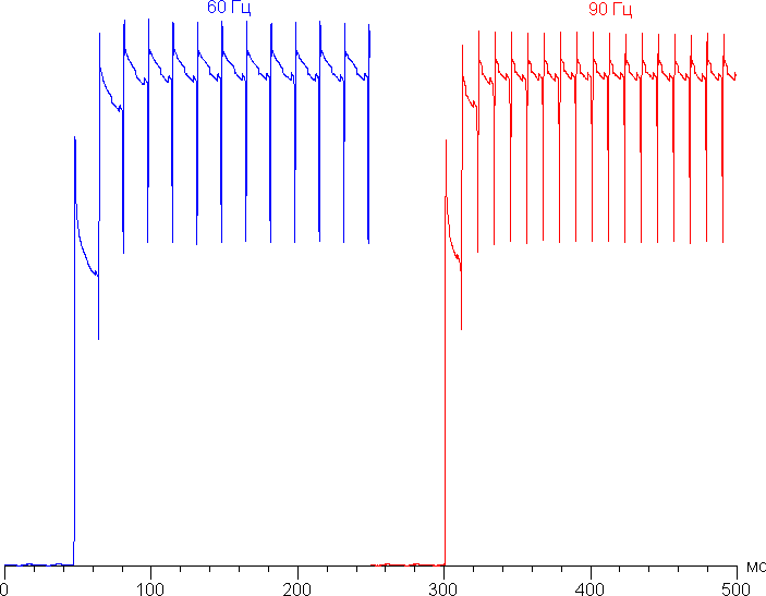 Переключение состояния элементов матрицы выполняется практически мгновенно, но на фронте включения может присутствовать ступенька шириной примерно 17 мс (что соответствует частоте обновления экрана примерно в 60 Гц) или примерно 11 мс (90 Гц). Например, так выглядит зависимость яркости от времени при переходе от черного к белому (режим 60 Гц и 90 Гц):