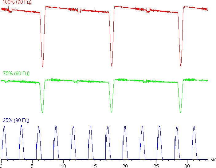 Частота модуляции на высокой яркости увеличилась до 90 Гц, а на средней и низкой характер модуляции такой же, что и в случае частоты обновления 60 Гц — мерцание можно обнаружить.