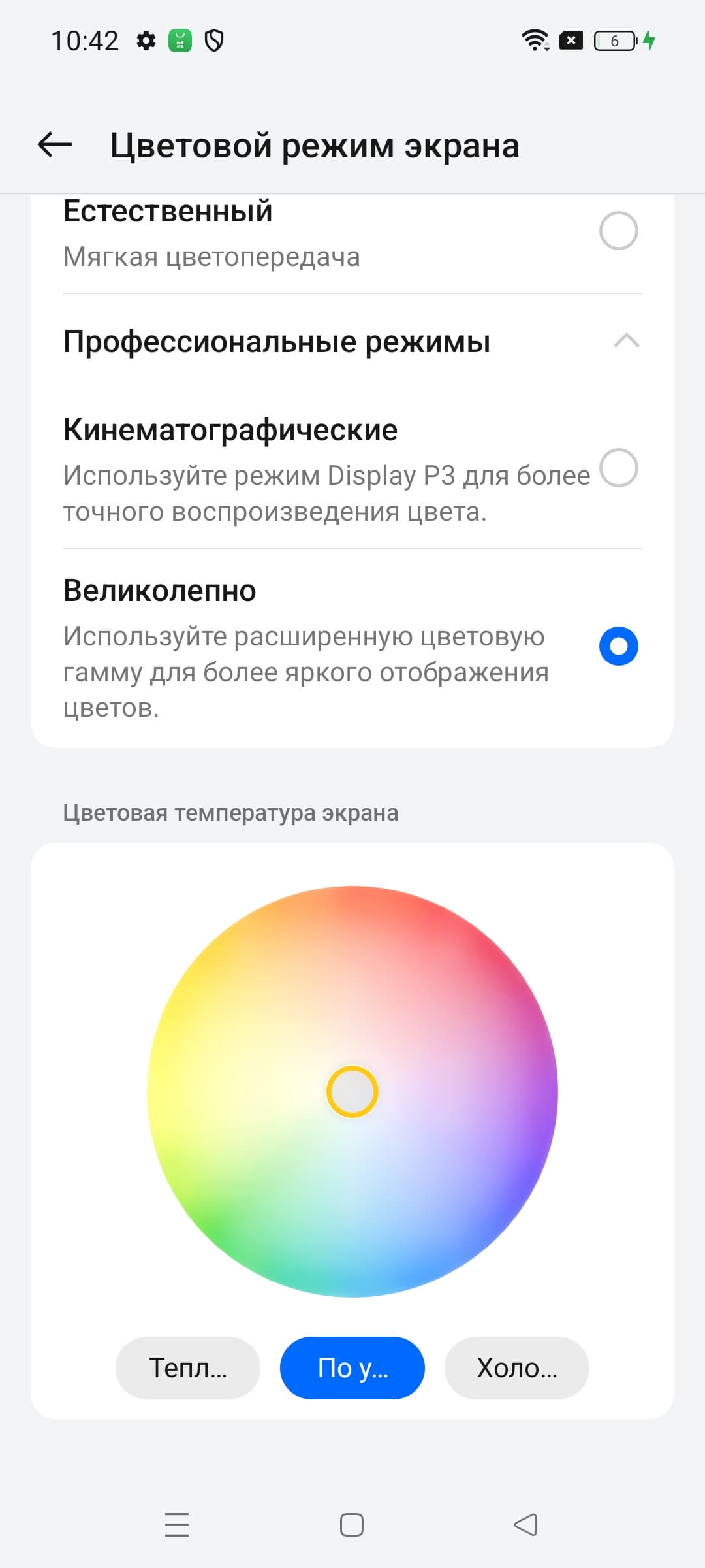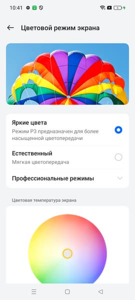 Фотография выше получена для профиля Яркие цвета в настройках экрана, который выбран по умолчанию. Профилей всего четыре: