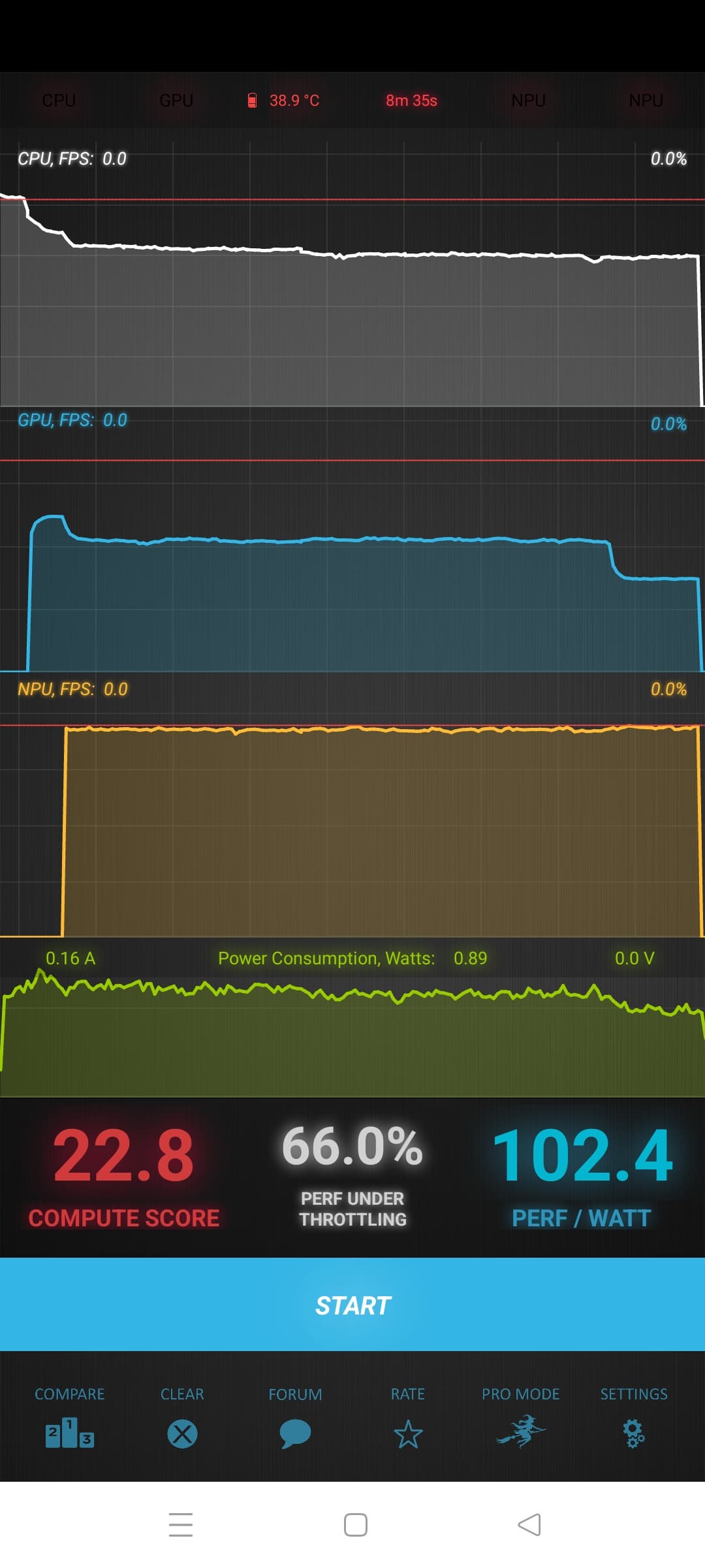 Тест на снижение производительности при нагреве мы проводим с помощью программы Burnout Benchmark, которая позволяет нагружать CPU, GPU и NPU: