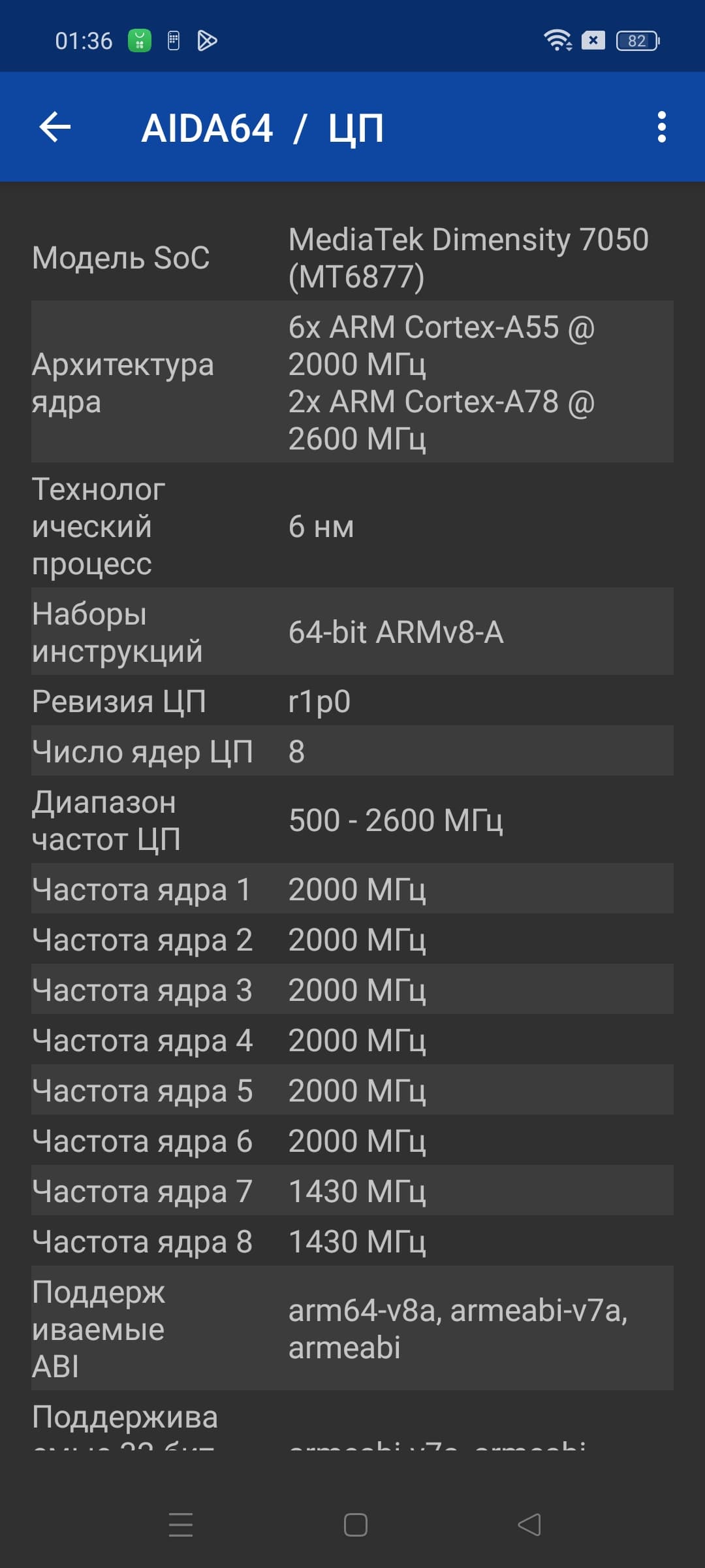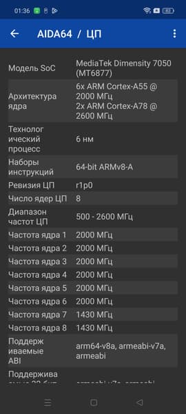 - SoC Mediatek Dimensity 7050, 8 процессорных ядер (2×Cortex-A78 @2,6 ГГц + 6×Cortex-A55 @2,0 ГГц)