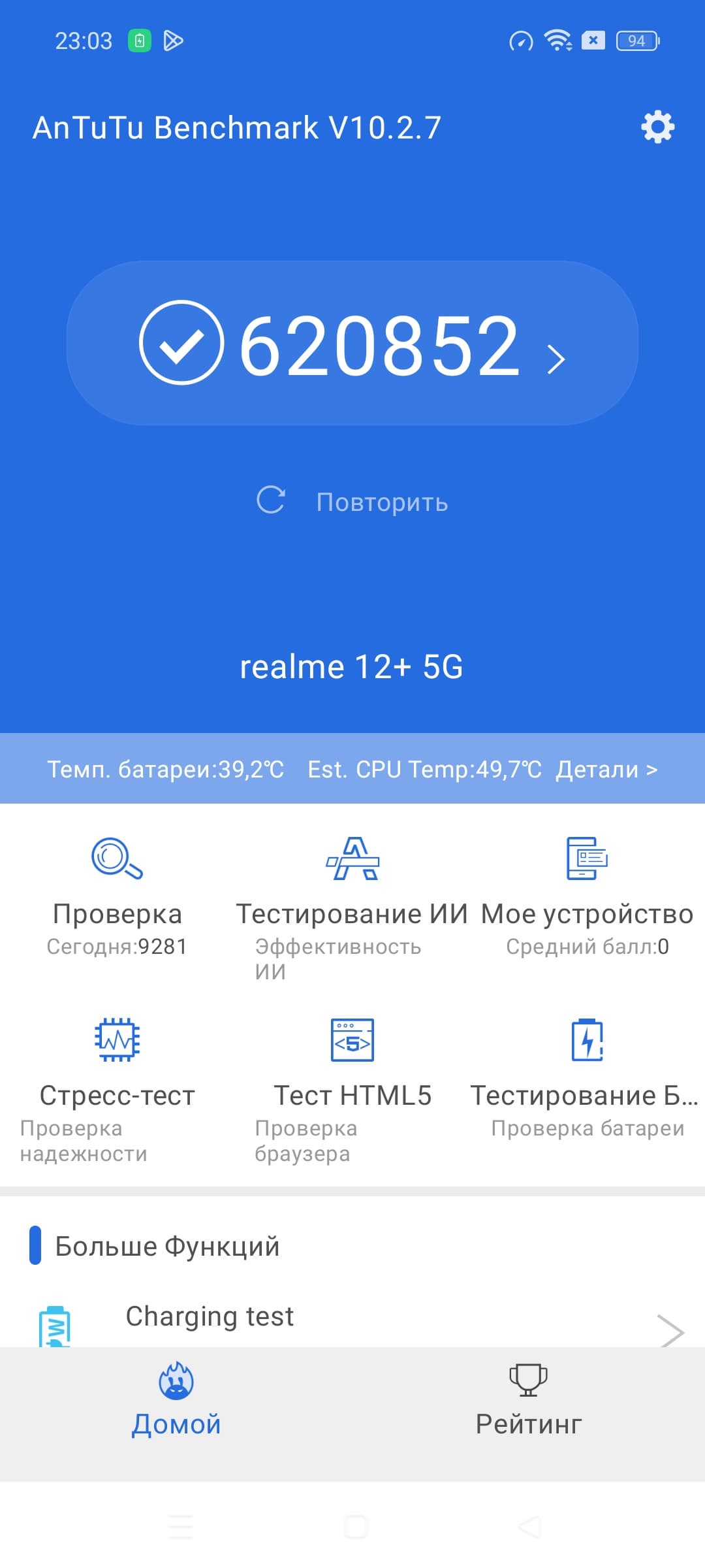 Смартфон Realme 12+ 5G получил батарею со стандартным объемом 5000 мА·ч, в тестах он демонстрирует высокий уровень автономности.