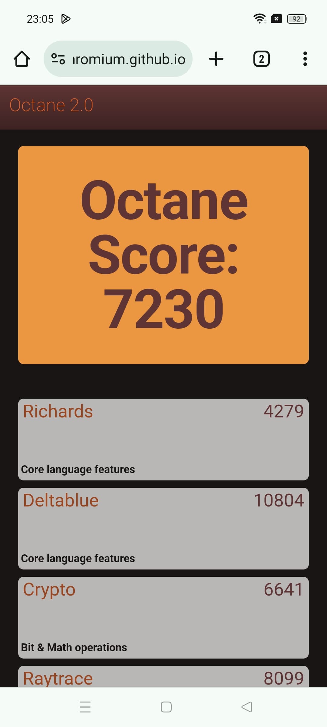 | Google Octane 2 (больше — лучше) | 7230 | 19467 | 24106 | 52617 | 30529 |