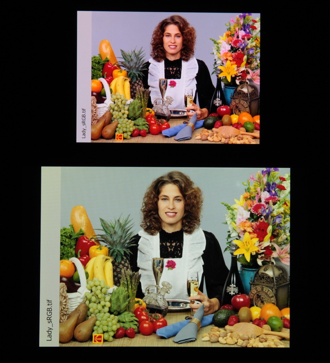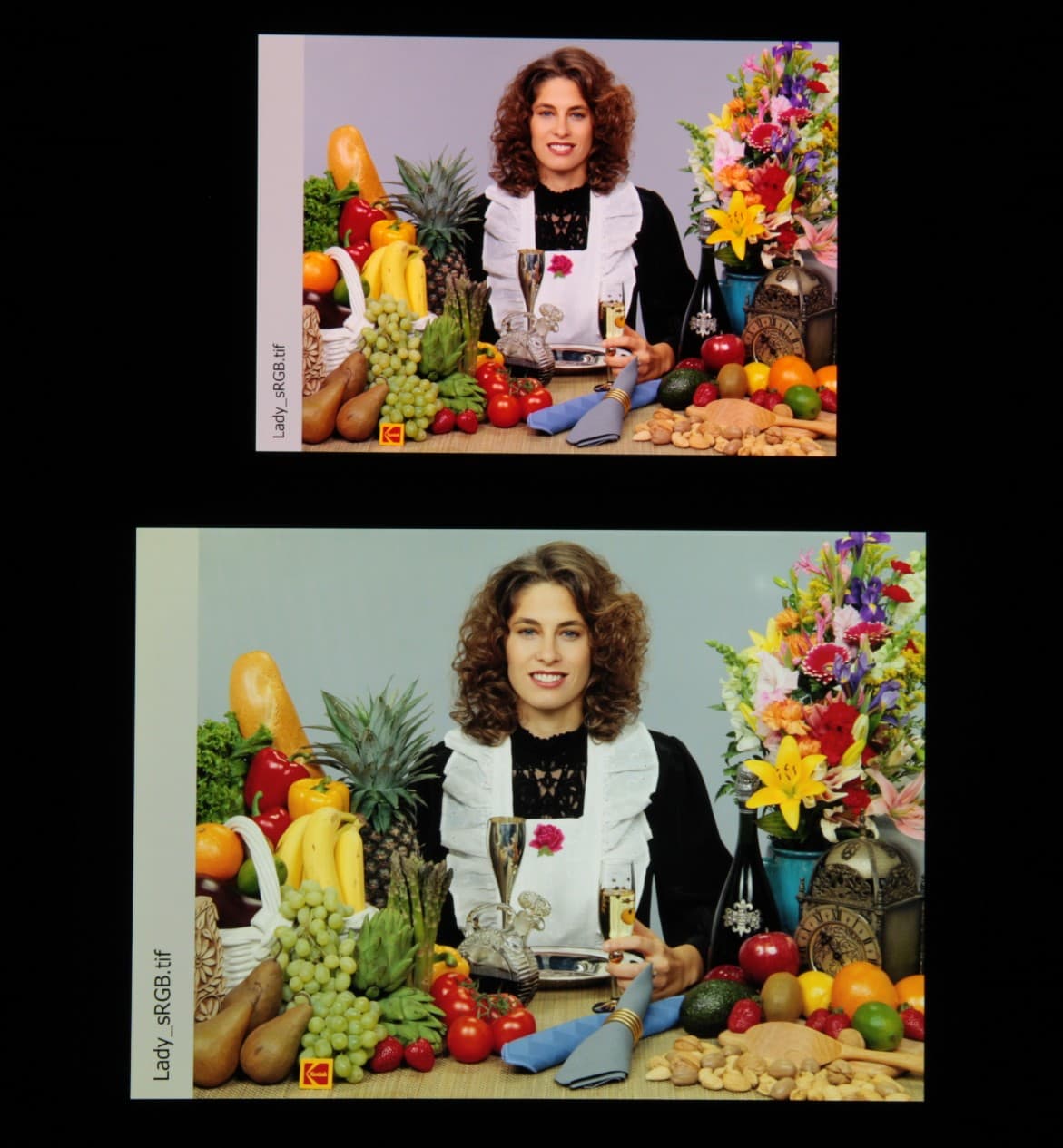 Цвета на экране смартфона перенасыщены (обратите внимание на помидоры, бананы, салфетку и оттенок лица), а цветовой баланс заметно отличается. Напомним, что фотография не может служить надежным источником сведений о качестве цветопередачи и приводится только для условной наглядной иллюстрации. В частности, выраженный красноватый оттенок белого и серого полей, присутствующий на фотографиях экрана смартфона, при перпендикулярном взгляде визуально отсутствует, что подтверждается аппаратными тестами с помощью спектрофотометра. Причина в том, что спектральная чувствительность матрицы фотоаппарата неточно совпадает с этой характеристикой человеческого зрения.