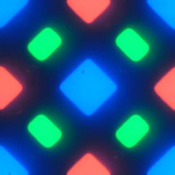 В этом экране используется матрица Super AMOLED — активная матрица на органических светодиодах. Полноцветное изображение создается с помощью субпикселей трех цветов — красного (R), зеленого (G) и синего (B), но красных и синих субпикселей в два раза меньше, что можно обозначить как RGBG. Это подтверждается фрагментом микрофотографии: