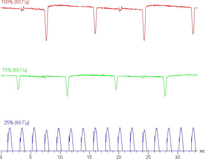 На любом уровне яркости присутствует значимая модуляция с частотой 12 или 480 Гц. На рисунке ниже приведены зависимости яркости (вертикальная ось) от времени (горизонтальная ось) для нескольких значений настройки яркости. Сначала для режима с частотой обновления 60 Гц: