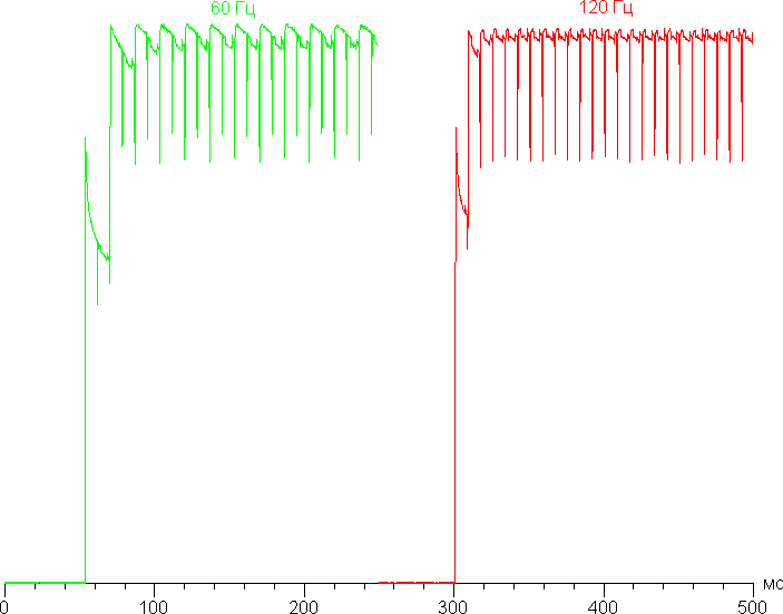 Переключение состояния элементов матрицы выполняется практически мгновенно, но на фронте включения может присутствовать ступенька шириной примерно 17 мс (что соответствует частоте обновления экрана примерно в 60 Гц) или примерно 8 мс (120 Гц). Например, так выглядит зависимость яркости от времени при переходе от черного к белому (режим 60 Гц и 120 Гц):