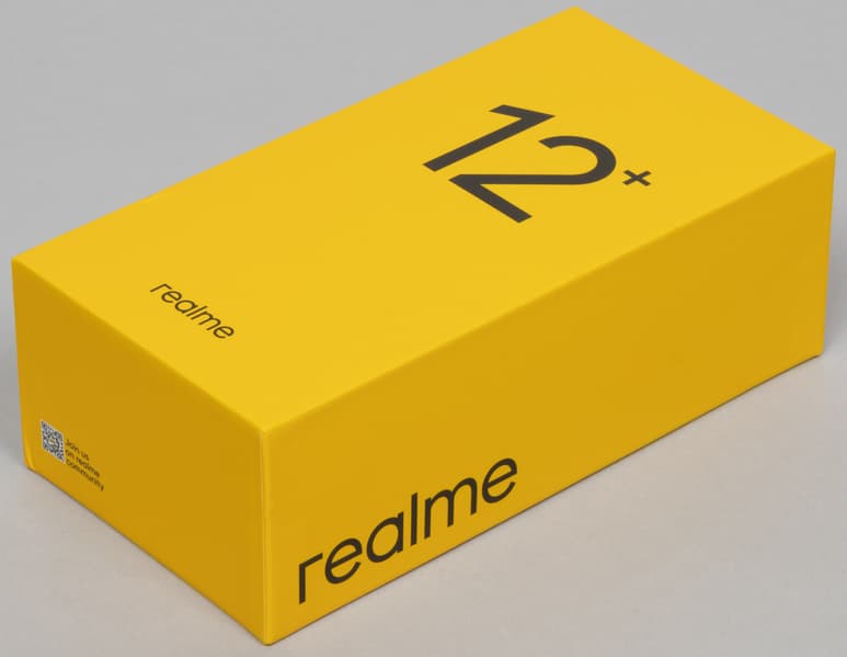 Смартфон Realme 12+ 5G поставляется в картонной коробке с оформлением в фирменных цветах бренда.