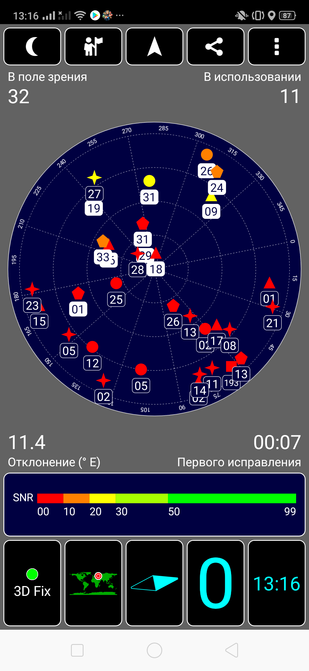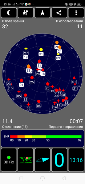 Навигационный модуль работает с GPS (с A-GPS) и Глонасс, а также Beidou и даже Galileo. Первые спутники при холодном старте обнаруживаются в течение первой минуты, точность позиционирования неплохая. Магнитный компас, необходимый для работы навигационных программ, в аппарате имеется.