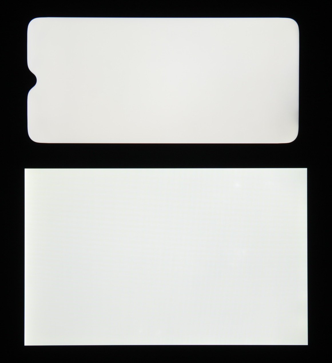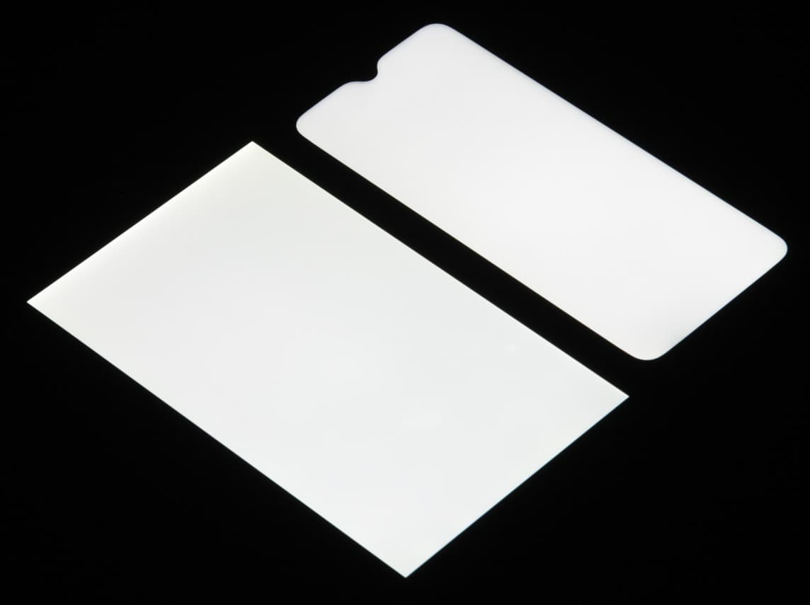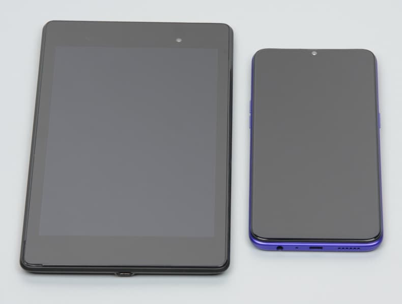 Лицевая поверхность экрана выполнена в виде стеклянной пластины с зеркально-гладкой поверхностью, устойчивой к появлению царапин. Судя по отражению объектов, антибликовые свойства экрана лучше, чем у экрана Google Nexus 7 (2013) (далее просто Nexus 7). Для наглядности приведем фотографию, на которой в выключенных экранах отражается белая поверхность (слева — Nexus 7, справа — realme 3 Pro, далее их можно различать по размеру):