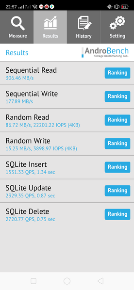 Результаты теста AndroBench на скорость работы с памятью: