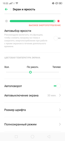 При ручном управлении яркостью и при выводе белого поля во весь экран максимальное значение яркости составило около 550 кд/м², минимальное — 2 кд/м². Максимальная яркость очень высокая, и, учитывая отличные антибликовые свойства, читаемость экрана даже в солнечный день вне помещения должна быть на хорошем уровне. В полной темноте яркость можно понизить до комфортного значения. В наличии автоматическая регулировка яркости по датчику освещенности (он находится правее и выше фронтальной камеры). В автоматическом режиме при изменении внешних условий освещенности яркость экрана как повышается, так и понижается. Работа этой функции зависит от положения ползунка регулировки яркости: им пользователь может попытаться выставить желаемый уровень яркости в текущих условиях. Если не вмешиваться, то в полной темноте функция автояркости уменьшает яркость до 5 кд/м² (низковато), в условиях освещенного искусственным светом офиса (примерно 550 лк) устанавливает на 110-165 кд/м² (нормально), под очень ярким светом, условно на прямом солнечном свету, повышает до 550 кд/м² (до максимума, так и нужно). Мы немного увеличили яркость в полной темноте и получили: в темноте — 20 кд/м², в условиях освещенного искусственным светом офиса — 110-165 кд/м², под очень ярким светом — 550 кд/м². Такой результат нас устроил. Получается, что функция автоподстройки яркости работает адекватно и позволяет пользователю настраивать свою работу под индивидуальные требования. Правда, настройку придется повторять после каждого выключения и последующего включения функции автоподстройки. На любом уровне яркости значимая модуляция подсветки отсутствует, поэтому нет и никакого мерцания экрана.