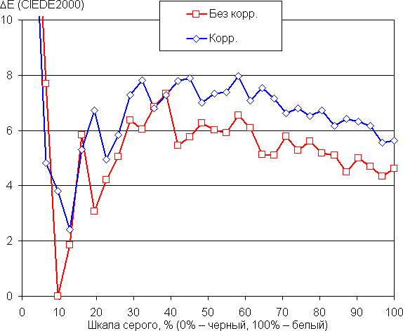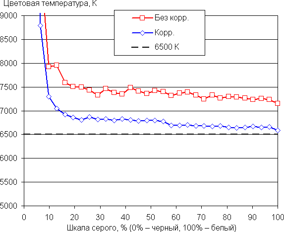 Результат после ручной коррекции (как на снимке выше) хороший (см. графики ниже), поскольку цветовая температура становится ближе к стандартным 6500 К, а отклонение от спектра абсолютно черного тела (ΔE) остается ниже 10, что для потребительского устройства считается неплохим показателем. При этом цветовая температура и ΔE мало изменяются от оттенка к оттенку — это положительно сказывается на визуальной оценке цветового баланса. (Самые темные области шкалы серого можно не учитывать, так как там баланс цветов не имеет большого значения, да и погрешность измерений цветовых характеристик на низкой яркости большая.)