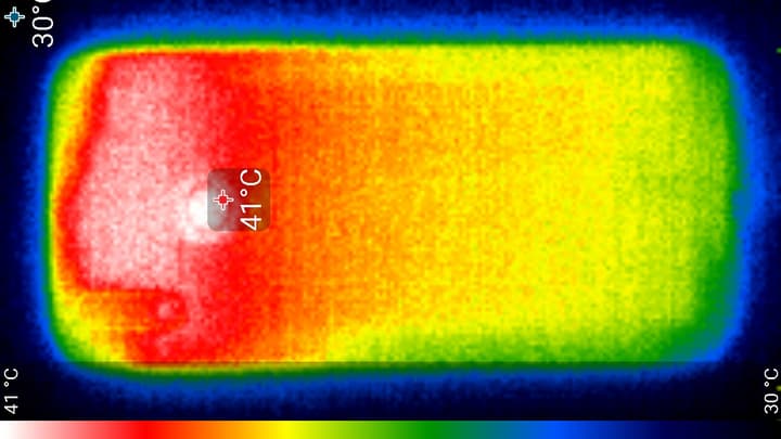 Нагрев больше вверху, что, видимо, соответствует расположению микросхемы SoC. По данным теплокамеры, максимальный нагрев составил 41 градус (при температуре окружающего воздуха в 24 градуса), это средний нагрев в данном тесте для современных смартфонов.