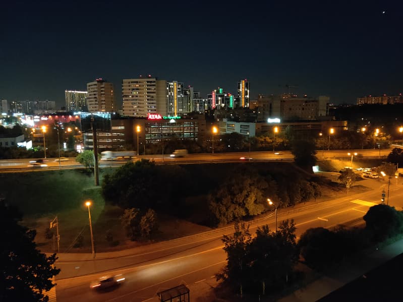 В ночном режиме камера делает и сшивает воедино несколько последовательных снимков, пытаясь ликвидировать результат дрожания рук. Результат получается светлым и адекватно передает источники освещения и подсвеченные участки, но показывать его можно только в виде миниатюры (желательно на экране смартфона и издалека), поскольку светочувствительность снимков для короткой выдержки задирается до неадекватных значений и деталей на снимке просто не остается. В то же время, при съемке ночью в обычном режиме, если вы сумеете компенсировать дрожание рук при относительно длинной выдержке, смартфон выдает очень хорошую картинку, уступающую разве что специализированным ночным режимам флагманов. Таким образом, для обоих возможных сценариев ночной съемки смартфон подходит очень хорошо.