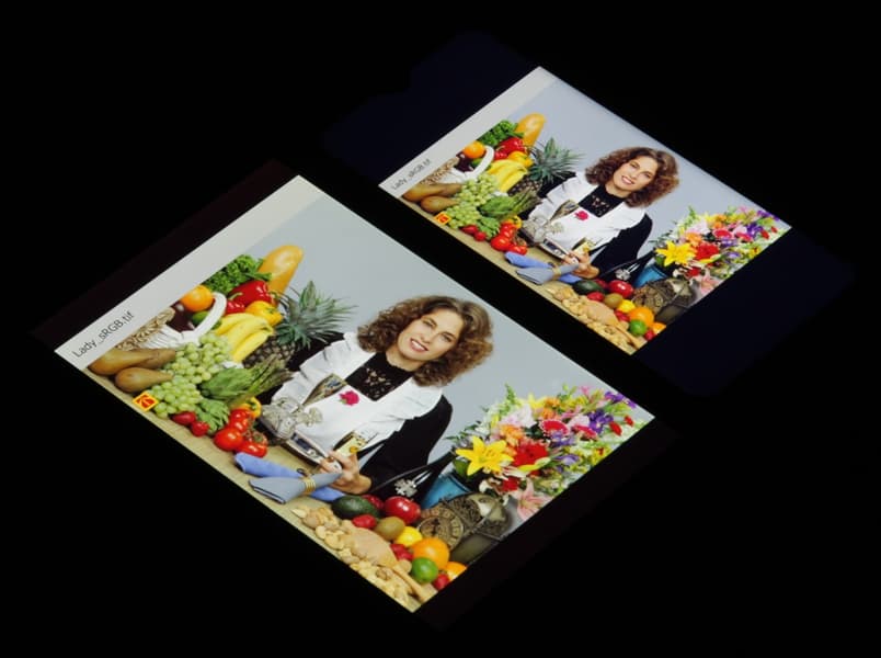 Экран имеет хорошие углы обзора без значительного сдвига цветов даже при больших отклонениях взгляда от перпендикуляра к экрану и без инвертирования оттенков. Для сравнения приведем фотографии, на которых на экраны realme 3 Pro и Nexus 7 выведены одинаковые изображения, при этом яркость экранов изначально установлена примерно на 200 кд/м², а цветовой баланс на фотоаппарате принудительно переключен на 6500 К.