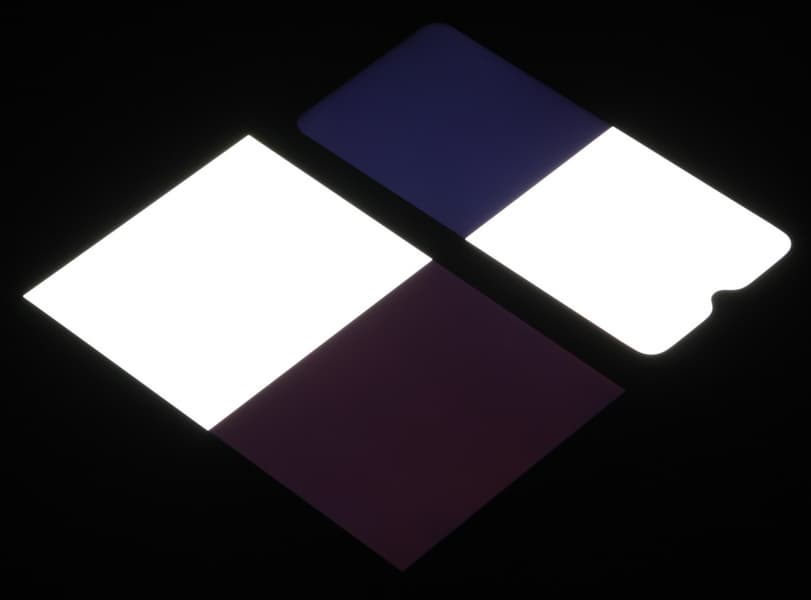 Яркость под углом у экранов уменьшилась (как минимум в 4 раза, исходя из разницы в выдержке), но у realme 3 Pro яркость под этим углом все же чуть выше. Черное поле при отклонении по диагонали высветляется слабо (но все же немного больше, чем у Nexus 7) и приобретает выраженный фиолетовый оттенок. Фотографии ниже это демонстрируют (яркость белых участков в перпендикулярном плоскости экранов направлении одинаковая!):