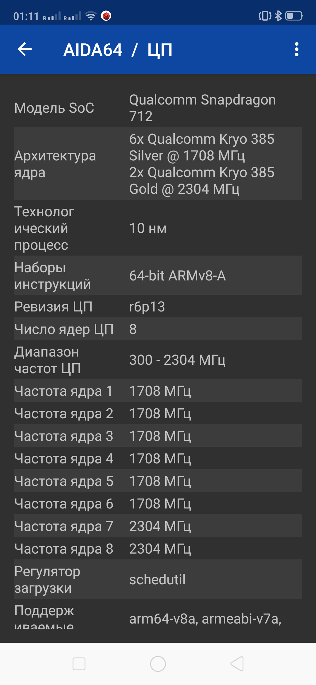 - SoC Qualcomm Snapdragon 712, 8 ядер (2×Kryo 360 Gold @2,3 ГГц + 6×Kryo 360 Silver @1,7 ГГц)