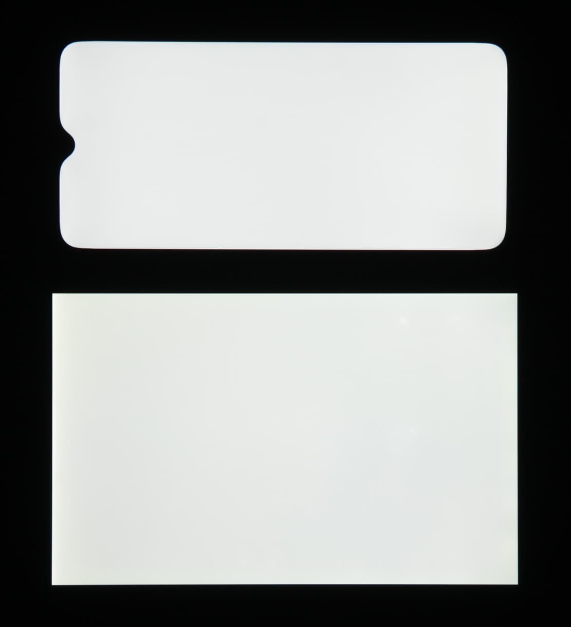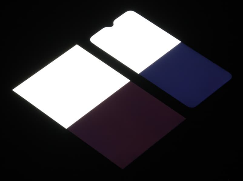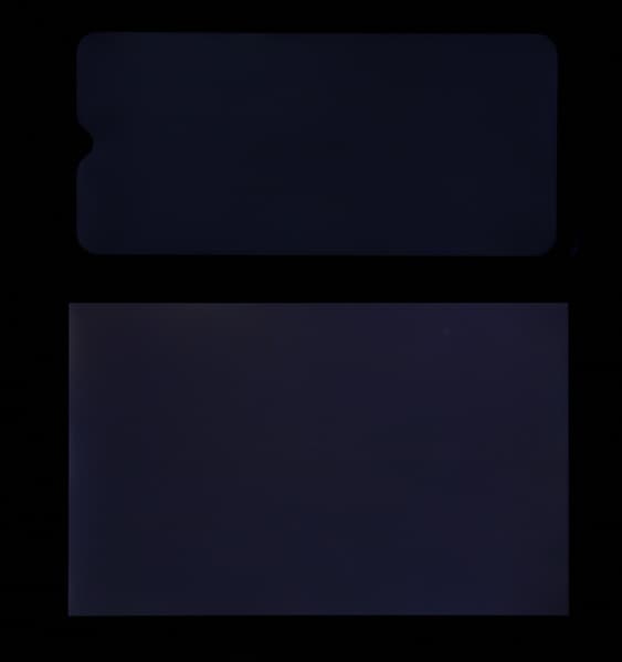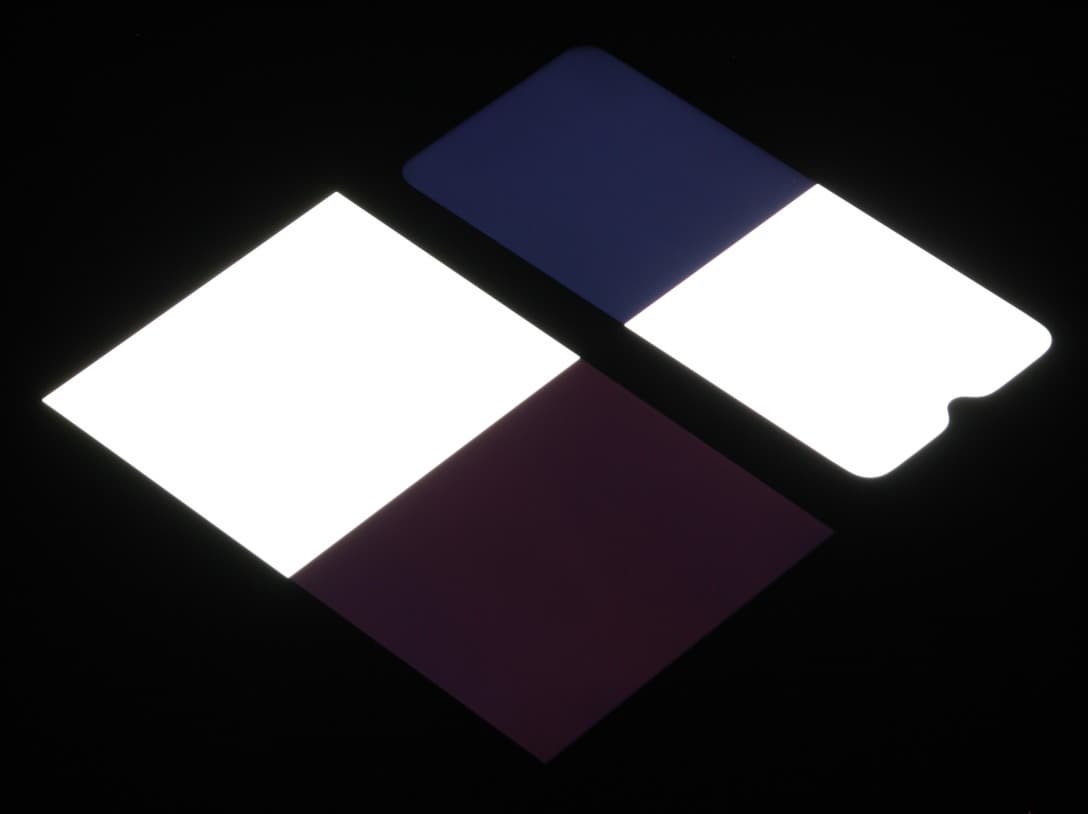 Яркость под углом у экранов уменьшилась (как минимум в 4 раза, исходя из разницы в выдержке), но у Realme 5 Pro яркость под этим углом все же чуть выше. Черное поле при отклонении по диагонали высветляется слабо (но все же немного больше, чем у Nexus 7) и приобретает выраженный фиолетовый оттенок. Фотографии ниже это демонстрируют (яркость белых участков в перпендикулярном плоскости экранов направлении одинаковая!):