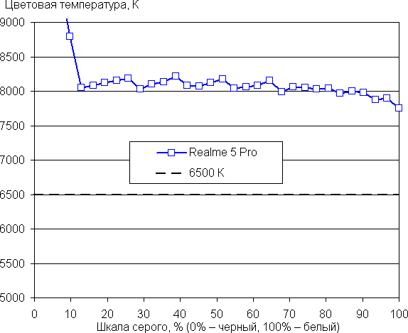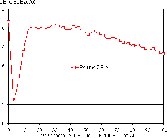 Однако снижение цветовой температуры приводит к росту отклонения от спектра абсолютно черного тела (ΔE), которое и так не низкое. В итоге в коррекции смысла нет. Тем не менее, даже по умолчанию цветовой баланс приемлемый, так как завышение цветовой температуры не очень большое, а ΔE или ниже 10, или чуть-чуть выше, что для потребительского устройства считается неплохим показателем. При этом цветовая температура и ΔE мало изменяются от оттенка к оттенку — это положительно сказывается на визуальной оценке цветового баланса. (Самые темные области шкалы серого можно не учитывать, так как там баланс цветов не имеет большого значения, да и погрешность измерений цветовых характеристик на низкой яркости большая.)