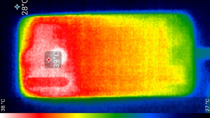 Нагрев больше вверху, что, видимо, соответствует расположению микросхемы SoC. По данным теплокамеры, максимальный нагрев составил 39 градусов (при температуре окружающего воздуха в 24 градуса), это средний нагрев в данном тесте для современных смартфонов.