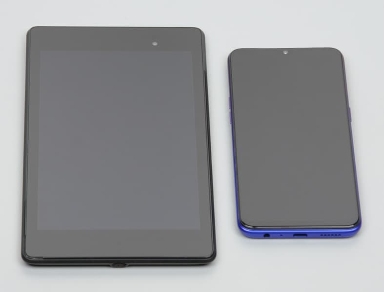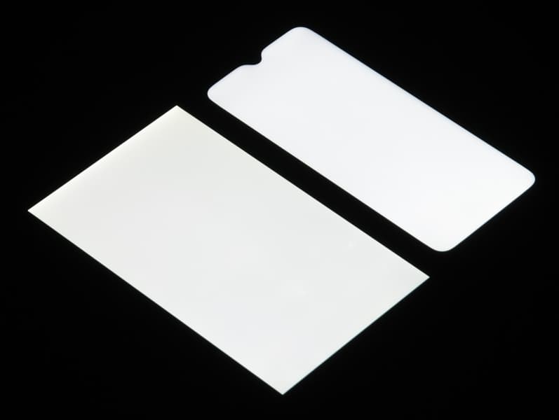 Лицевая поверхность экрана выполнена в виде стеклянной пластины с зеркально-гладкой поверхностью, устойчивой к появлению царапин. Судя по отражению объектов, антибликовые свойства экрана лучше, чем у экрана Google Nexus 7 (2013) (далее просто Nexus 7). Для наглядности приведем фотографию, на которой в выключенных экранах отражается белая поверхность (слева — Nexus 7, справа — Realme 5 Pro, далее их можно различать по размеру):