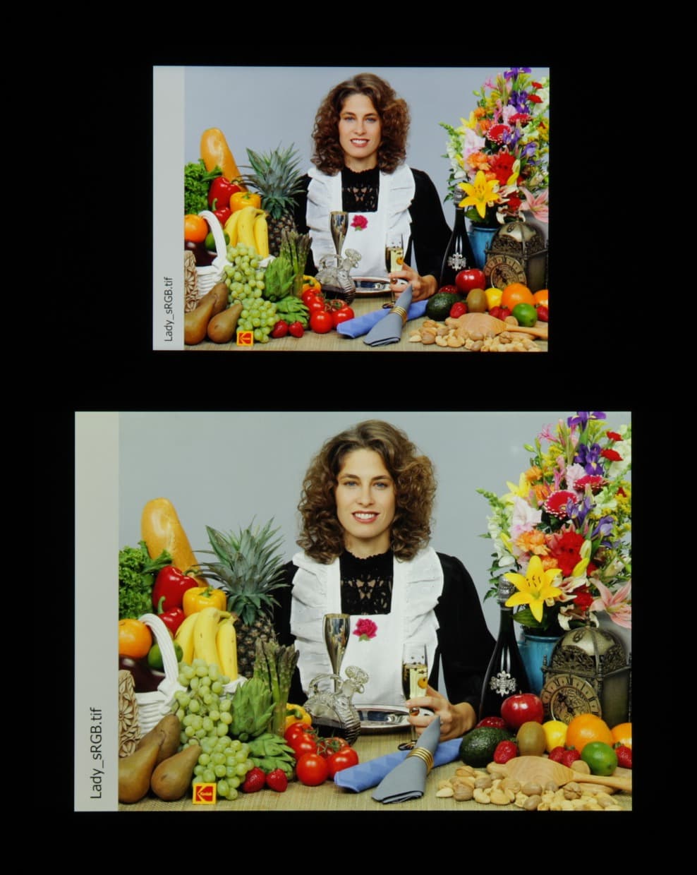 При этом горбы зеленого и красного цветов относительно хорошо разделены, что и приводит к некоторому уширению цветового охвата. Кроме того, тестовые изображения показывают, что есть некоторое завышение цветового контраста, из-за чего не самые насыщенные оттенки выглядят чуть ярче, чем нужно.