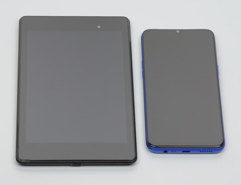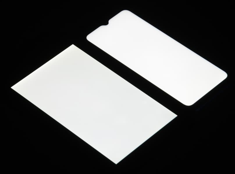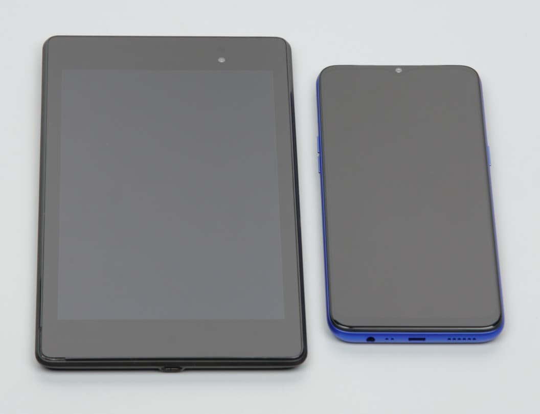 Лицевая поверхность экрана выполнена в виде стеклянной пластины с зеркально-гладкой поверхностью, устойчивой к появлению царапин. Судя по отражению объектов, антибликовые свойства экрана лучше, чем у экрана Google Nexus 7 (2013) (далее просто Nexus 7). Для наглядности приведем фотографию, на которой в выключенных экранах отражается белая поверхность (слева — Nexus 7, справа — Realme 5, далее их можно различать по размеру):