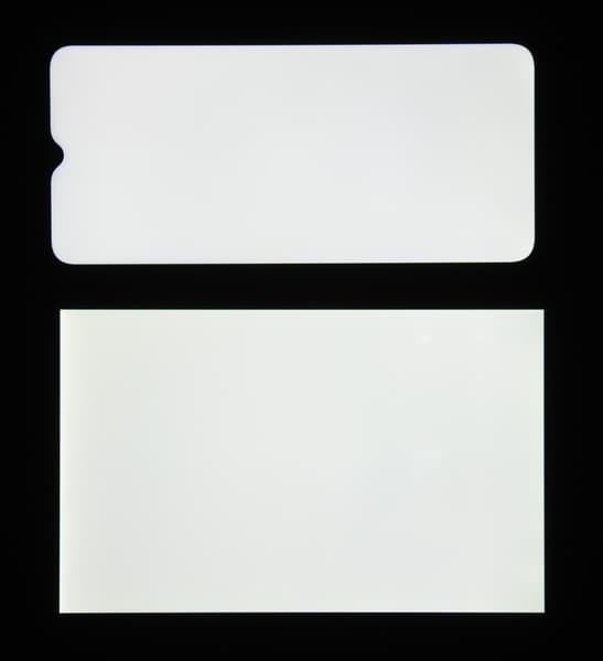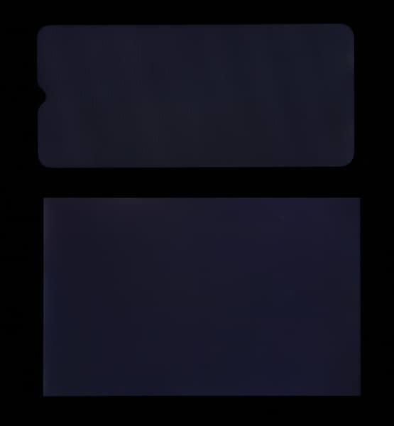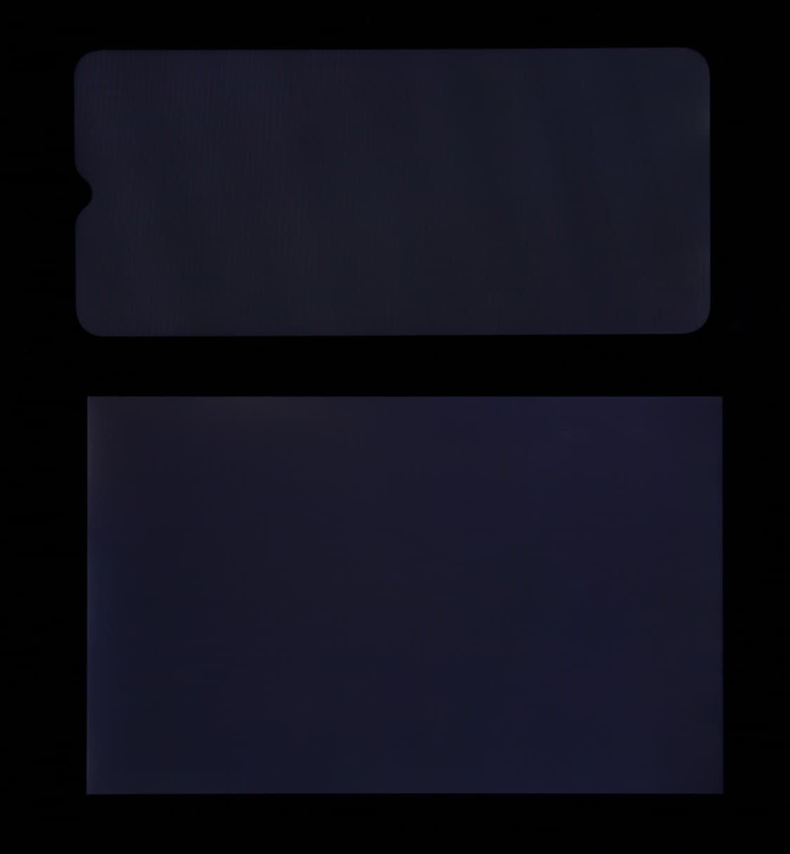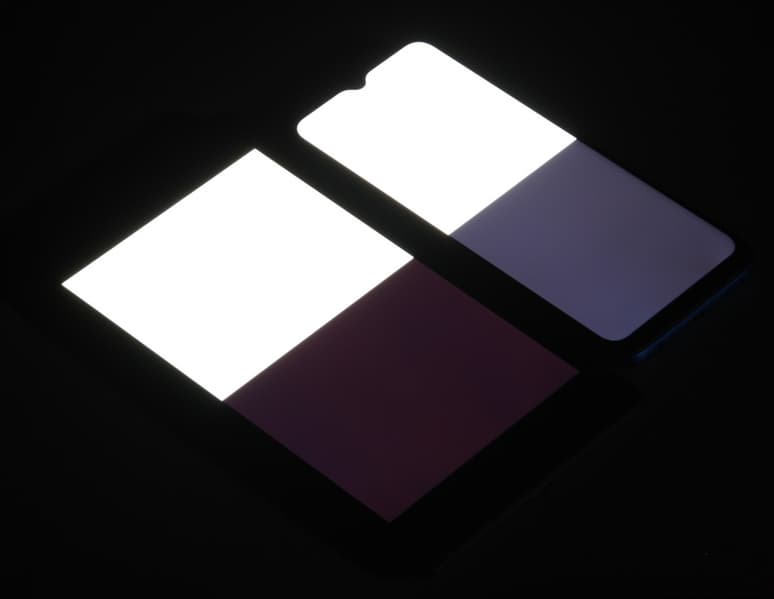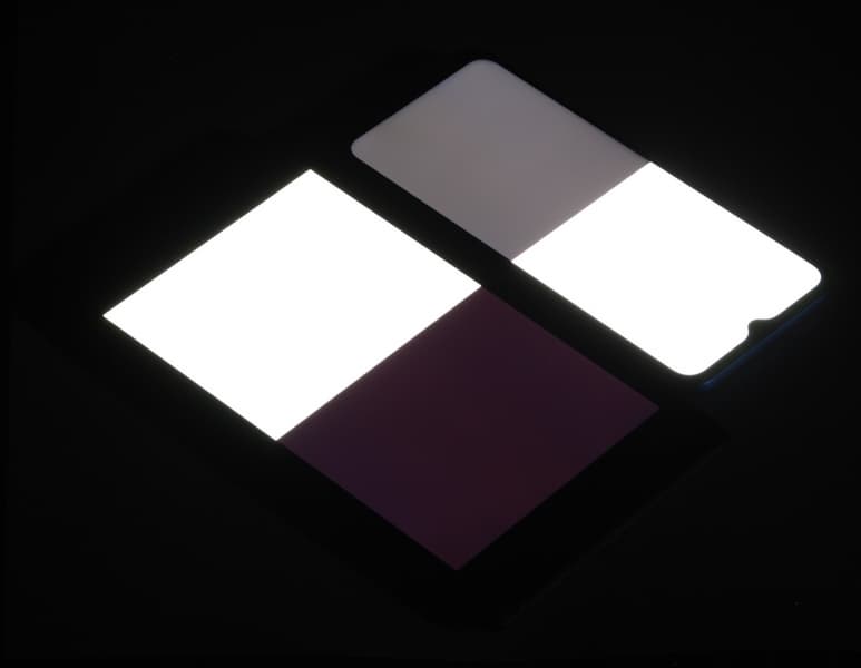 Яркость под углом у экранов уменьшилась (как минимум в 4 раза, исходя из разницы в выдержке), но у Realme 5 яркость под этим углом все же чуть выше. Черное поле при отклонении по диагонали сильно высветляется и приобретает легкий фиолетовый оттенок или остается условно нейтрально-серым. Фотографии ниже это демонстрируют (яркость белых участков в перпендикулярном плоскости экранов направлении одинаковая!):