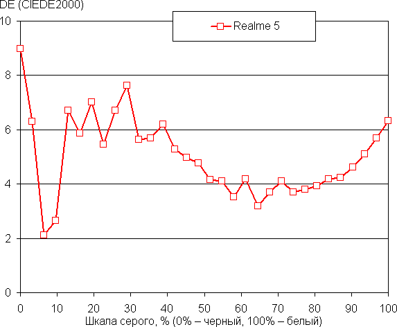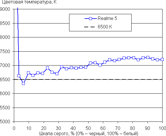 Результат после ручной коррекции приемлемый (ползунок настройки максимально сдвинут вправо, см. графики ниже), поскольку цветовая температура стала ближе к стандартным 6500 К, а отклонение от спектра абсолютно черного тела (ΔE) не превышает 10, что для потребительского устройства нормально. При этом цветовая температура и ΔE несильно изменяются от оттенка к оттенку — это положительно сказывается на визуальной оценке цветового баланса. (Самые темные области шкалы серого можно не учитывать, так как там баланс цветов не имеет большого значения, да и погрешность измерений цветовых характеристик на низкой яркости большая.)