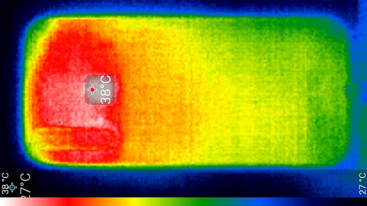 Нагрев больше вверху, что, видимо, соответствует расположению микросхемы SoC. По данным теплокамеры, максимальный нагрев составил 38 градусов (при температуре окружающего воздуха в 24 градуса), это не очень много.
