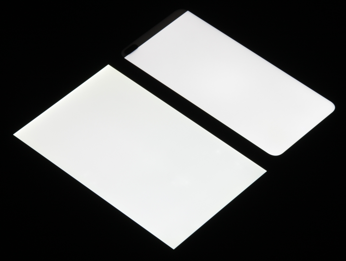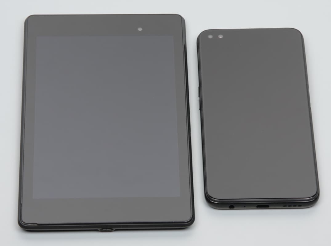 Лицевая поверхность экрана выполнена в виде стеклянной пластины с зеркально-гладкой поверхностью, устойчивой к появлению царапин. Судя по отражению объектов, антибликовые свойства экрана лучше, чем у экрана Google Nexus 7 (2013) (далее просто Nexus 7). Для наглядности приведем фотографию, на которой в выключенных экранах отражается белая поверхность (слева — Nexus 7, справа — Realme 6 Pro, далее их можно различать по размеру):