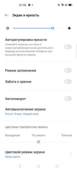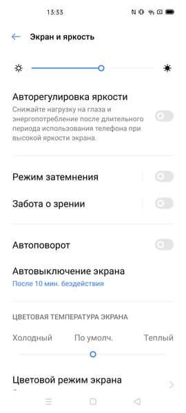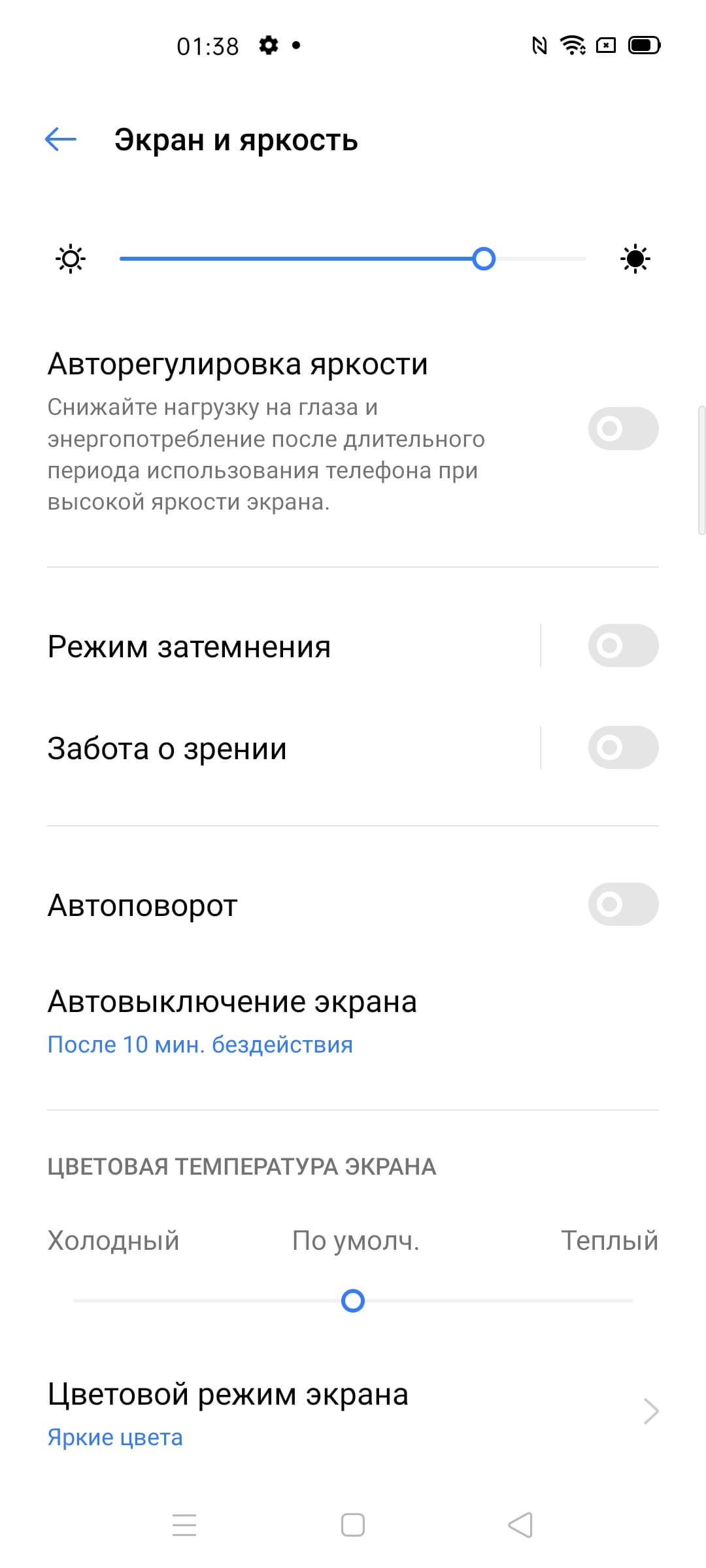 При ручном управлении яркостью и при выводе белого поля во весь экран максимальное значение яркости составило около 450 кд/м². Максимальная яркость высокая, и, учитывая отличные антибликовые свойства, читаемость экрана даже в солнечный день вне помещения должна быть на приемлемом уровне. Минимальное значение яркости — 2,4 кд/м², так что в полной темноте яркость можно понизить до комфортного значения. В наличии автоматическая регулировка яркости по датчику освещенности (он находится у верхней кромки фронтальной панели правее выреза громкоговорителя). В автоматическом режиме при изменении внешних условий освещенности яркость экрана как повышается, так и понижается. Работа этой функции зависит от положения ползунка регулировки яркости: им пользователь может попытаться выставить желаемый уровень яркости в текущих условиях. Если не вмешиваться, то в полной темноте функция автояркости уменьшает яркость до 13 кд/м² (подойдет), в условиях освещенного искусственным светом офиса (примерно 550 лк) устанавливает на 115 кд/м² (нормально), а условно на прямом солнечном свету яркость достигает 450 кд/м² (до максимума, так и нужно). Результат по умолчанию нас удовлетворил, но для эксперимента мы захотели в полной темноте яркость понизить. Поэтому мы подвинули ползунок чуть влево в условиях полной темноты и для трех условий, указанных выше, получили 3, 130 и 450 кд/м². Вроде бы то, что требовалось, но после цикла перехода в режим ожидания и последующего включения смартфона все вернулось к первоначальному варианту — 13, 115 и 450 кд/м². Получается, что функция автоподстройки яркости работает адекватно, но не позволяет пользователю настраивать свою работу под индивидуальные требования.