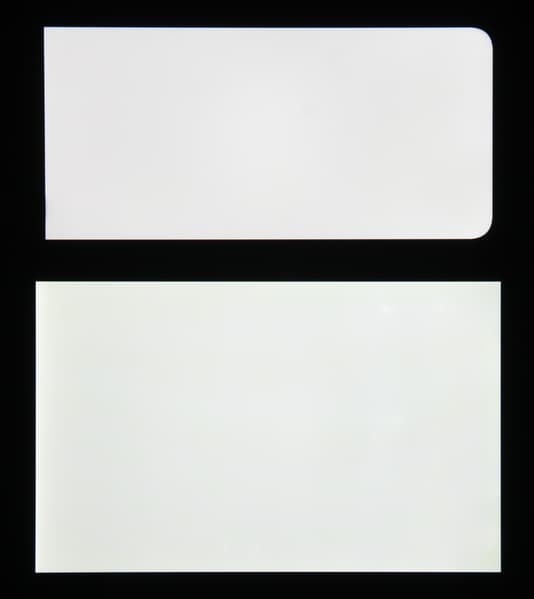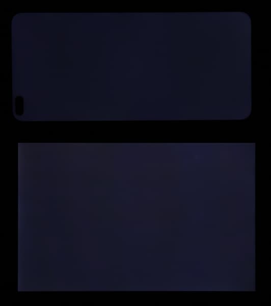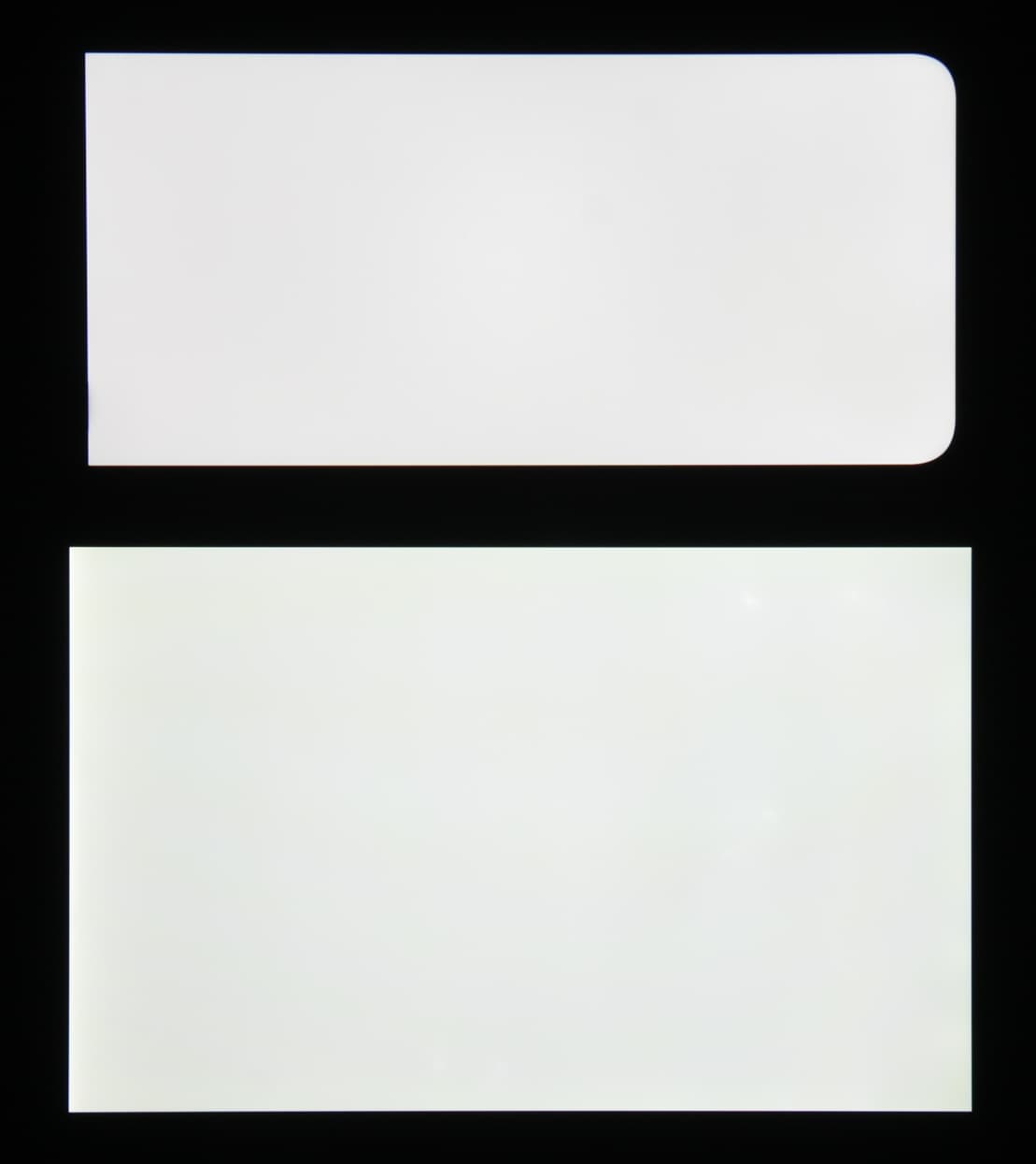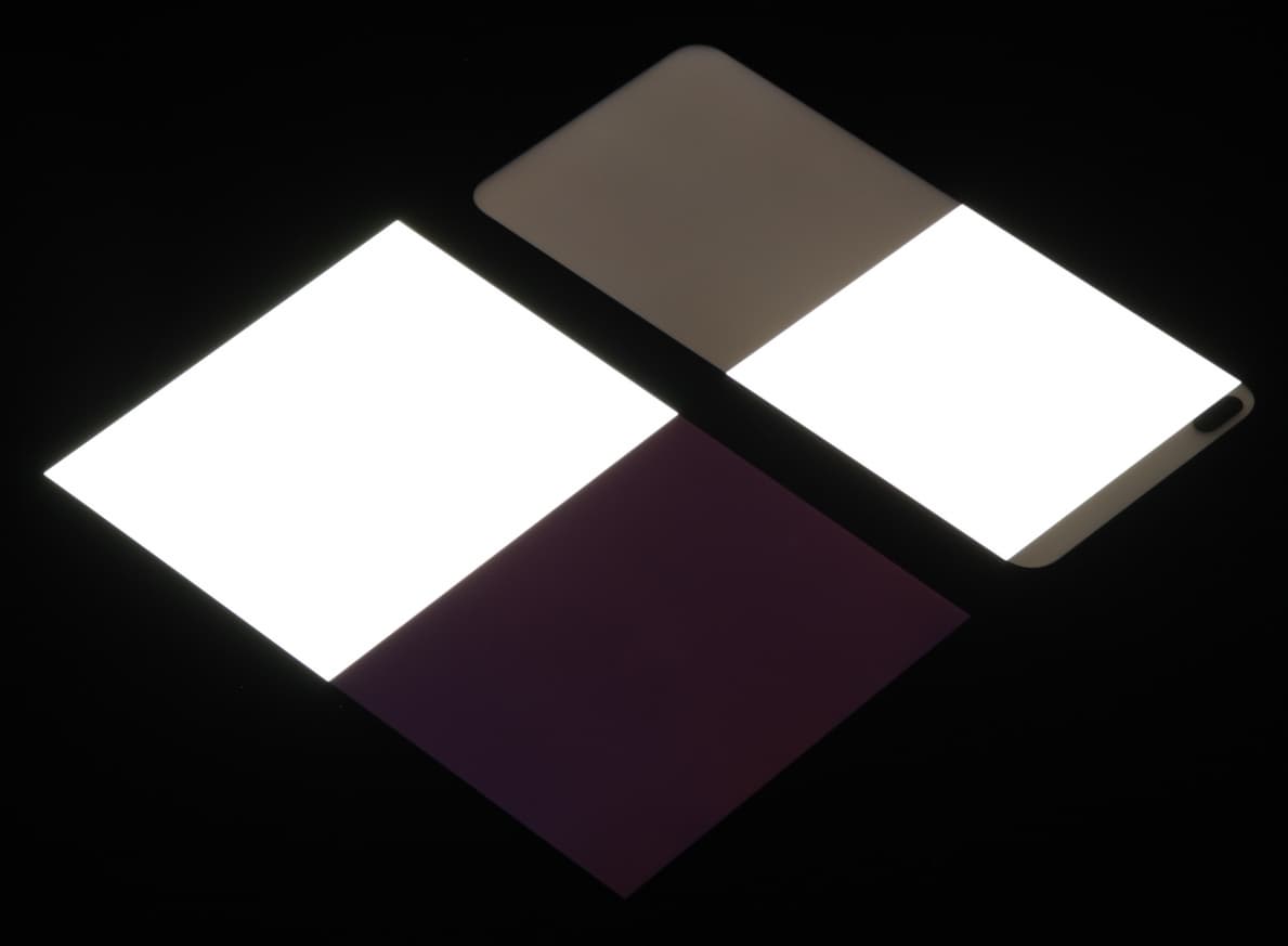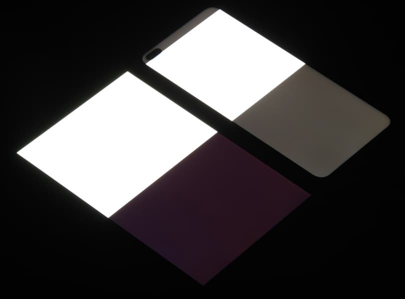 Яркость под углом у экранов уменьшилась (как минимум в 5 раз, исходя из разницы в выдержке), но у Realme 6 Pro яркость под этим углом все же чуть выше. Черное поле при отклонении по диагонали сильно высветляется, но остается условно нейтрально-серым. Фотографии ниже это демонстрируют (яркость белых участков в перпендикулярном плоскости экранов направлении одинаковая!):
