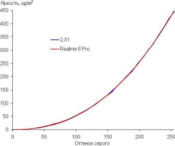 Контрастность (примерно в центре экрана) высокая — порядка 1100:1. Время отклика при переходе черный-белый-черный равно 13 мс (6,5 мс вкл. + 6,5 мс выкл.). Переход между полутонами серого 25% и 75% (по численному значению цвета) и обратно в сумме занимает 22 мс. Построенная по 32 точкам с равным интервалом по численному значению оттенка серого гамма-кривая не выявила завала ни в светах, ни в тенях. Показатель аппроксимирующей степенной функции равен 2,31, что выше стандартного значения 2,2. При этом реальная гамма-кривая немного отклоняется от степенной зависимости: