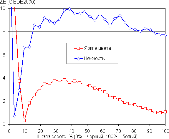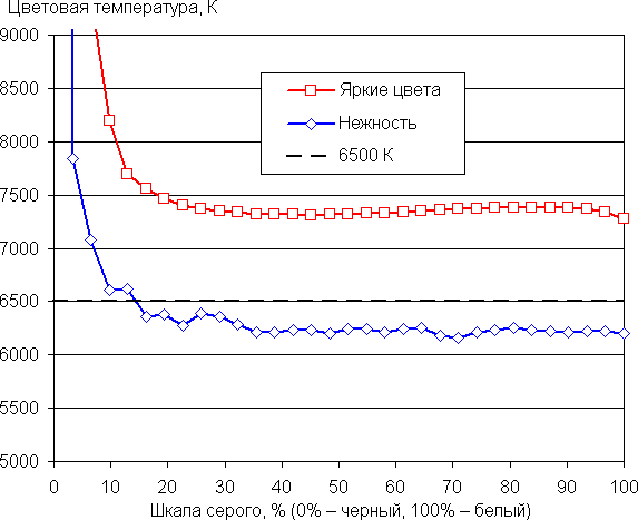 По умолчанию после выбора профиля Нежность цветовая температура на белом поле снижается до 6000 К, но указанной регулировкой цветовую температуру получается поднять хотя бы до 6100 К. В любом случае, баланс оттенков на шкале серого приемлемый, поскольку цветовая температура достаточно близка к стандартным 6500 К, а отклонение от спектра абсолютно черного тела (ΔE) ниже 10, что для потребительского устройства считается неплохим показателем. При этом цветовая температура и ΔE мало изменяются от оттенка к оттенку — это положительно сказывается на визуальной оценке цветового баланса. На графиках ниже представлены результаты, полученные при выборе профиля Яркие цвета и для профиля Нежность с описанной выше коррекций. (Самые темные области шкалы серого можно не учитывать, так как там баланс цветов не имеет большого значения, да и погрешность измерений цветовых характеристик на низкой яркости большая.)