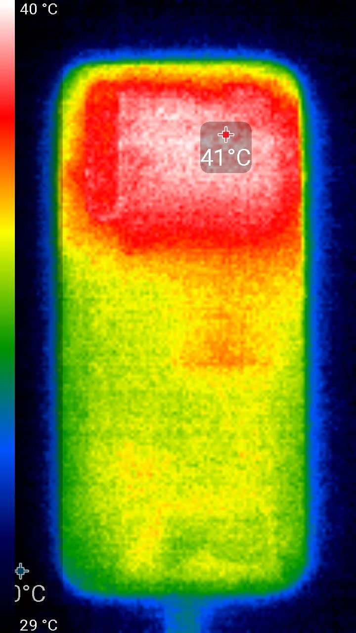 Нагрев больше в верхней части аппарата, что, видимо, соответствует расположению микросхемы SoC. По данным теплокамеры, максимальный нагрев составил 41 градус (при температуре окружающего воздуха в 24 градуса), это средний нагрев в данном тесте для современных смартфонов.