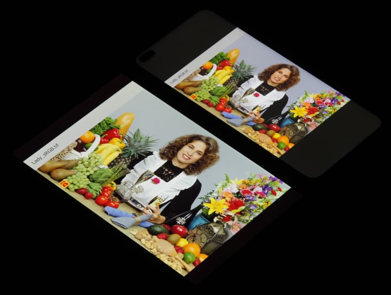 Экран имеет хорошие углы обзора без значительного сдвига цветов даже при больших отклонениях взгляда от перпендикуляра к экрану и без инвертирования оттенков. Для сравнения приведем фотографии, на которых на экраны Realme 6 Pro и Nexus 7 выведены одинаковые изображения, при этом яркость экранов изначально установлена примерно на 200 кд/м², а цветовой баланс на фотоаппарате принудительно переключен на 6500 К.