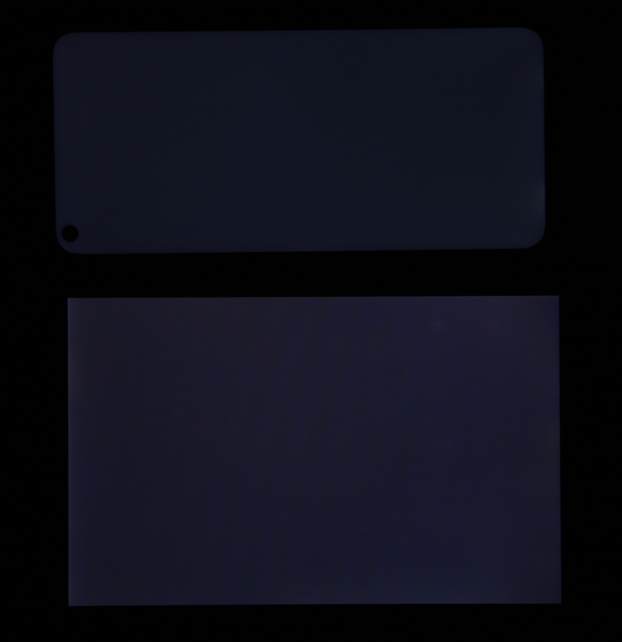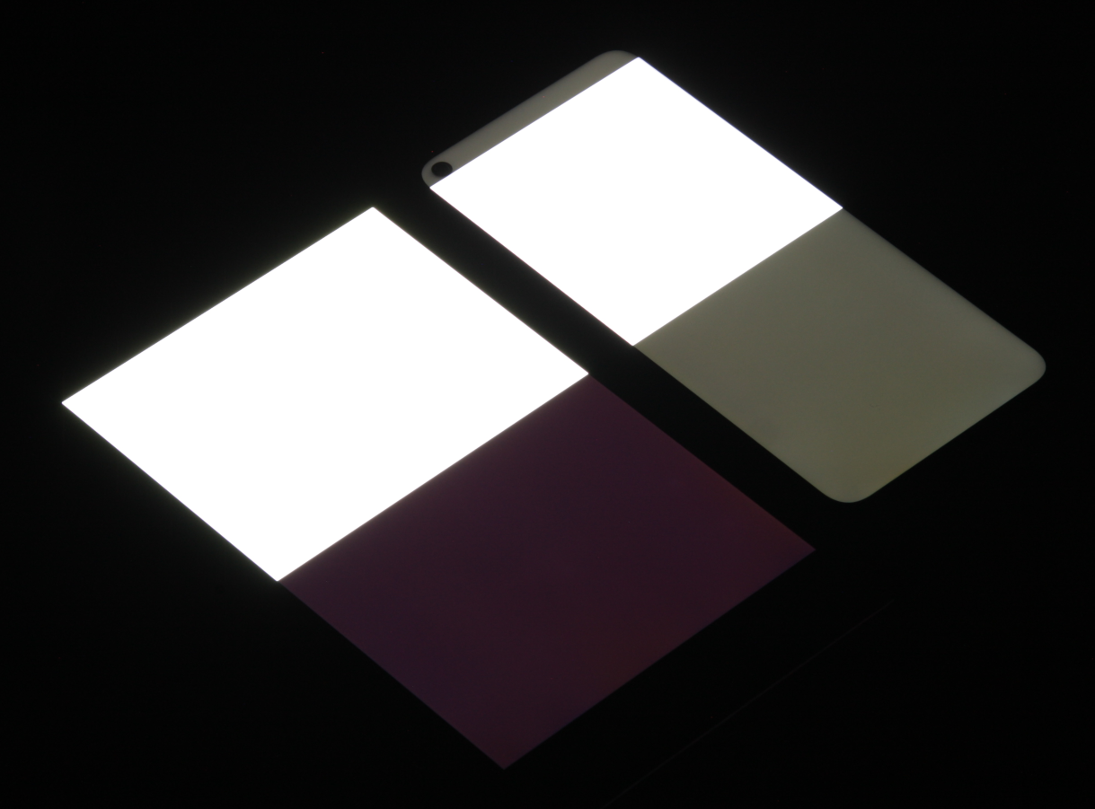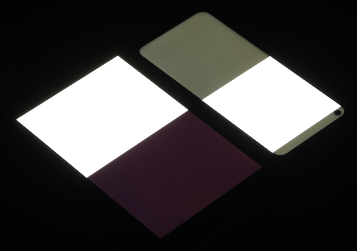 Яркость под углом у экранов уменьшилась (как минимум в 5 раз, исходя из разницы в выдержке), но у Realme 6s яркость под этим углом все же чуть ниже. Черное поле при отклонении по диагонали высветляется сильно, но остается условно нейтрально-серым. Фотографии ниже это демонстрируют (яркость белых участков в перпендикулярном плоскости экранов направлении одинаковая!):