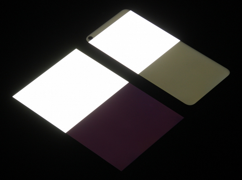 Яркость под углом у экранов уменьшилась (как минимум в 5 раз, исходя из разницы в выдержке), но у Realme 7 яркость под этим углом все же чуть выше. Черное поле при отклонении по диагонали высветляется сильно, но остается условно нейтрально-серым. Фотографии ниже это демонстрируют (яркость белых участков в перпендикулярном плоскости экранов направлении одинаковая!):