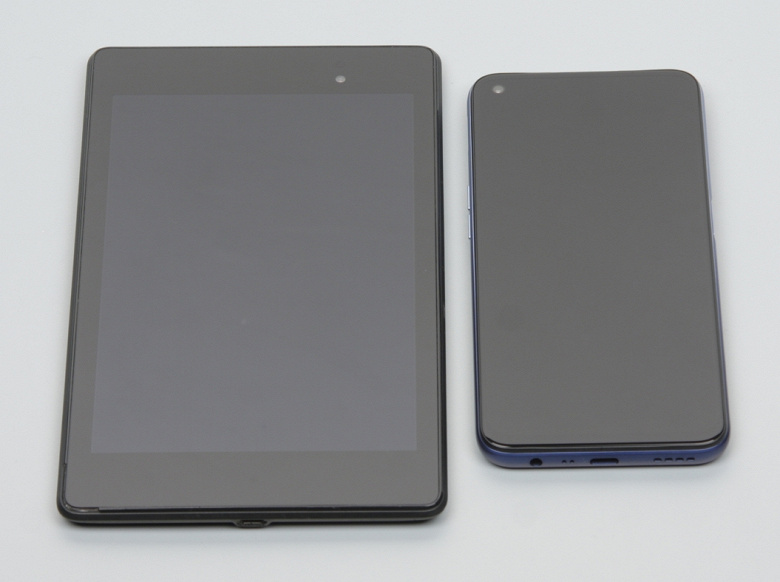 Лицевая поверхность экрана выполнена в виде стеклянной пластины с зеркально-гладкой поверхностью, устойчивой к появлению царапин. Судя по отражению объектов, антибликовые свойства экрана лучше, чем у экрана Google Nexus 7 (2013) (далее просто Nexus 7). Для наглядности приведем фотографию, на которой в выключенных экранах отражается белая поверхность (слева — Nexus 7, справа — Realme 7, далее их можно различать по размеру):
