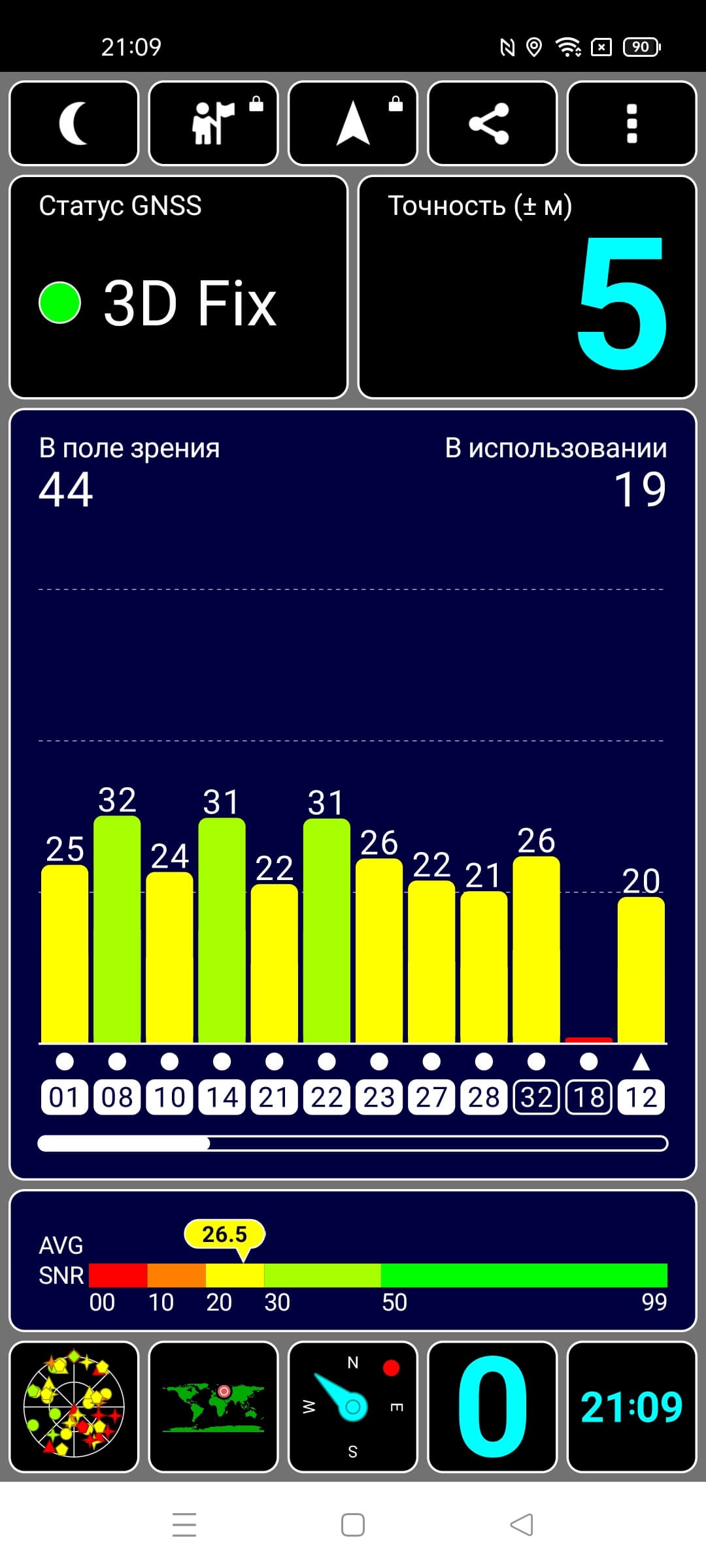 Навигационный модуль работает с GPS (с A-GPS), с отечественной Глонасс, с китайской Beidou и с европейской Galileo. Первые спутники даже при холодном старте обнаруживаются быстро, точность позиционирования не вызывает претензий.
