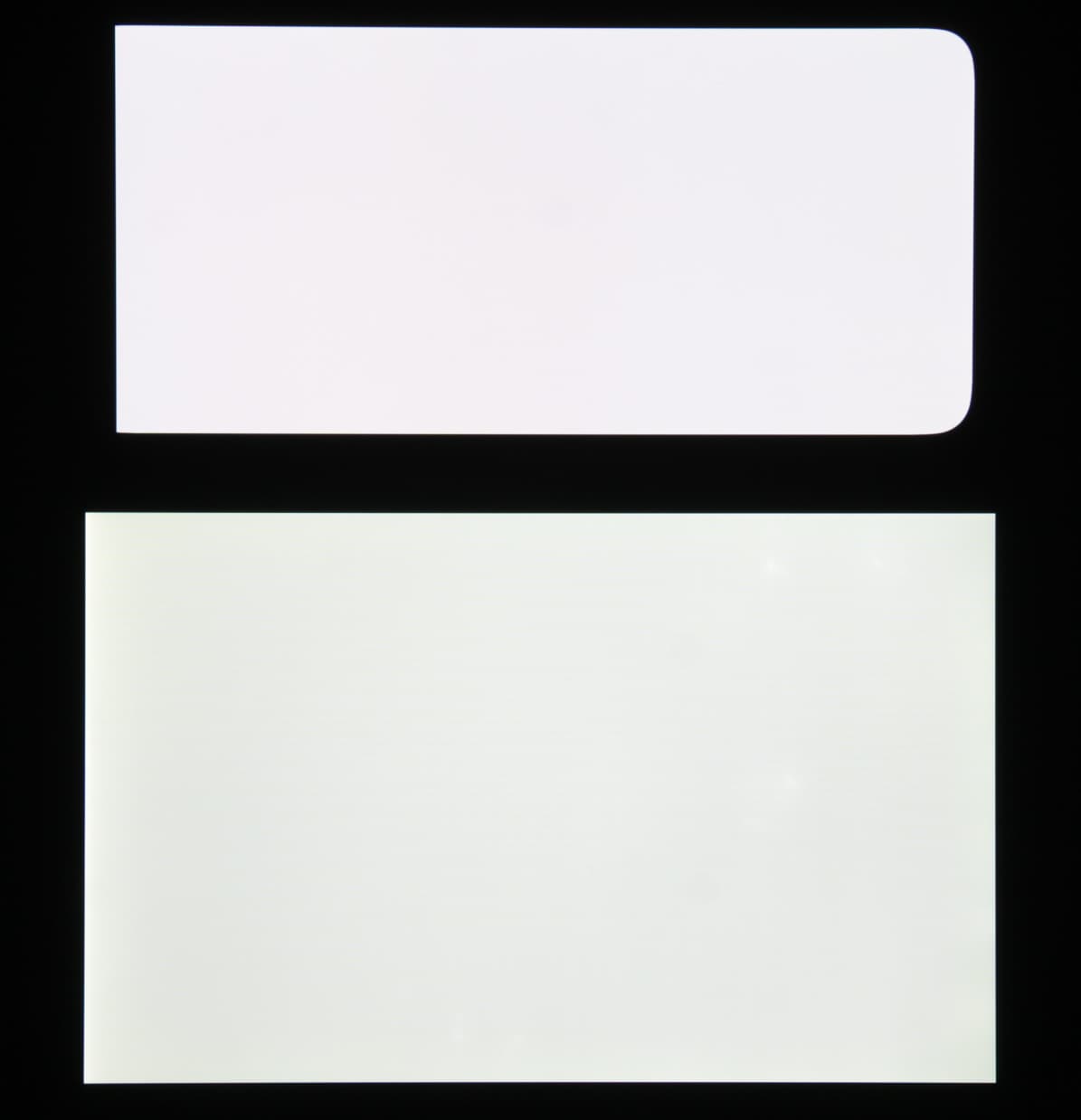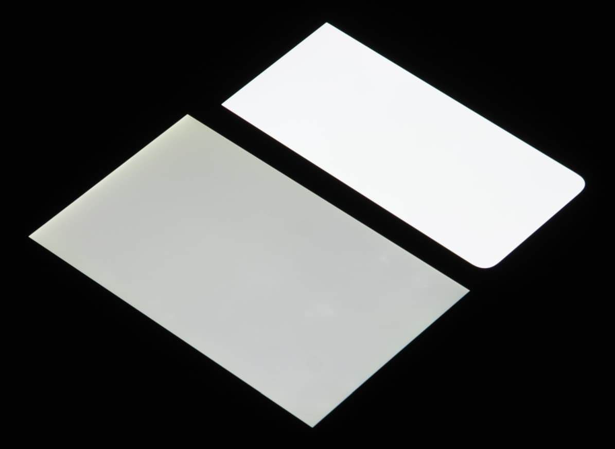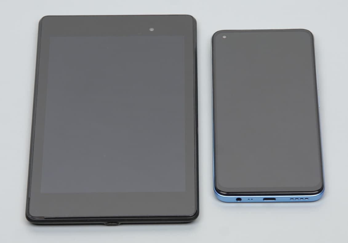 Лицевая поверхность экрана выполнена в виде стеклянной пластины с зеркально-гладкой поверхностью, устойчивой к появлению царапин. Судя по отражению объектов, антибликовые свойства экрана не хуже, чем у экрана Google Nexus 7 (2013) (далее просто Nexus 7). Для наглядности приведем фотографию, на которой в выключенных экранах отражается белая поверхность (слева — Nexus 7, справа — Realme 8 Pro, далее их можно различать по размеру):