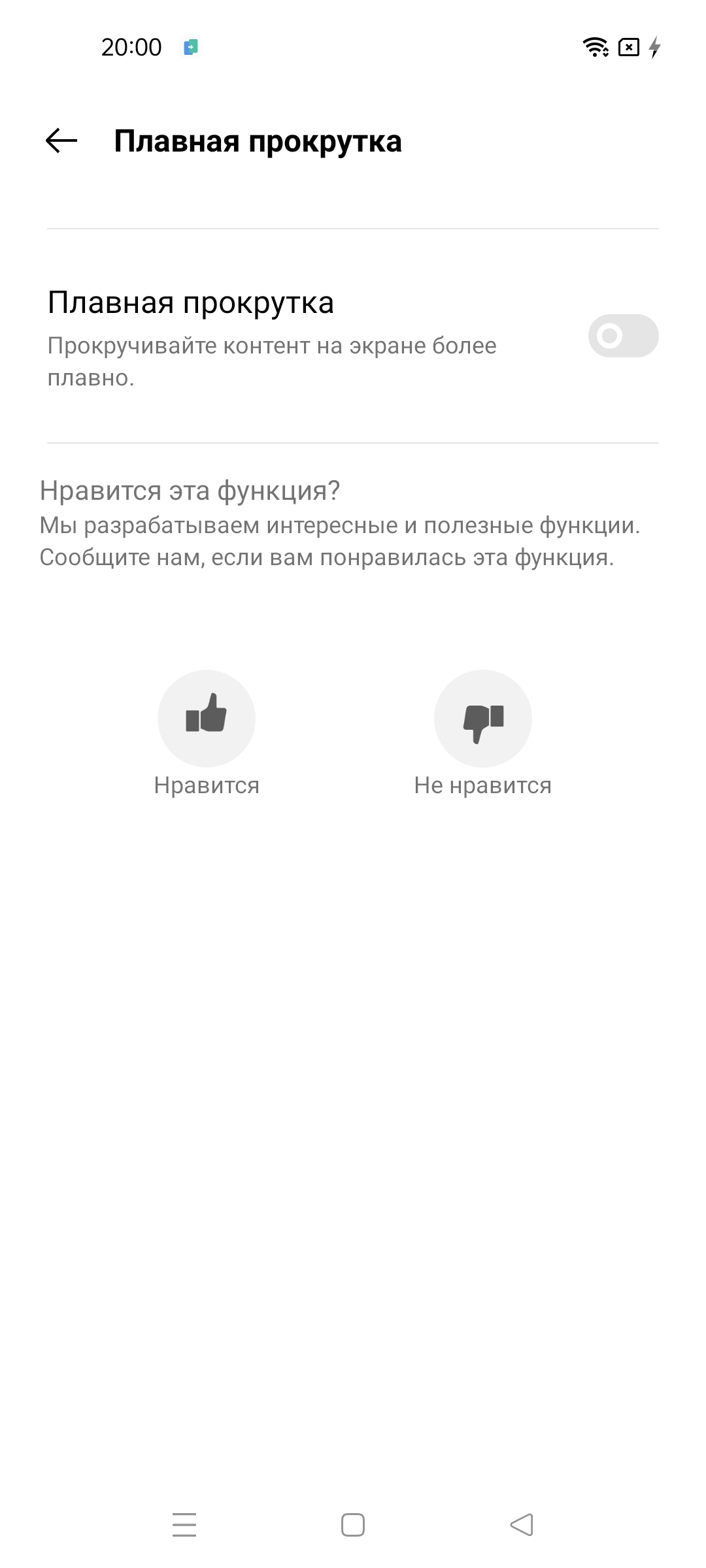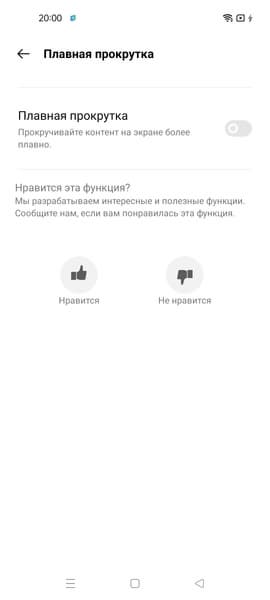 В Лаборатории realme также есть функция Плавная прокрутка, которая по идее должна увеличивать частоту обновления, но по факту ни прокрутка плавнее не становится, ни частота не увеличивается.