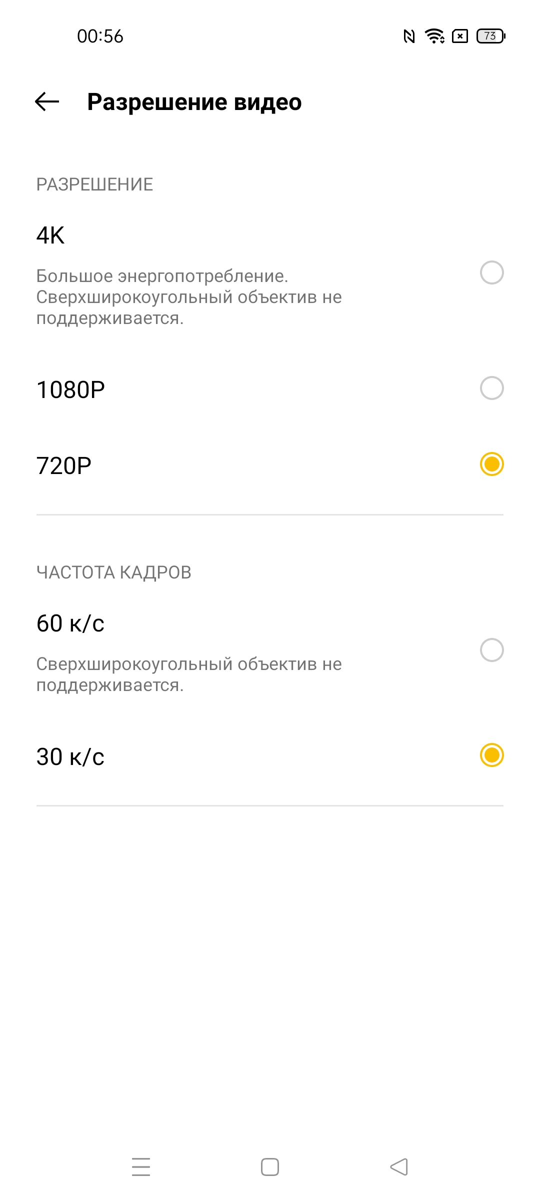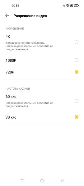 Видео камера умеет снимать в максимальном разрешении 3840×2160 (4К) при 30 fps. В режиме съемки видео в видоискателе почему-то вообще забыли разместить «шестеренку» настроек. Таким образом, чтобы изменить, например, разрешение видеосъемки, придется перейти в режим фотосъемки и уже оттуда войти в меню настроек. Странно.