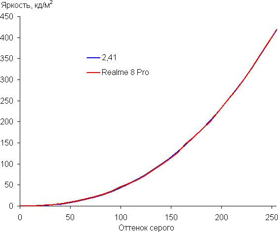 Напомним, что в случае OLED-экранов яркость фрагментов изображения динамично меняется в соответствии с характером выводимого изображения — немного уменьшается для светлых в целом изображений. В итоге полученная зависимость яркости от оттенка (гамма-кривая), скорее всего, не точно соответствует гамма-кривой статичного изображения, так как измерения проводились при последовательном выводе оттенков серого почти на весь экран.