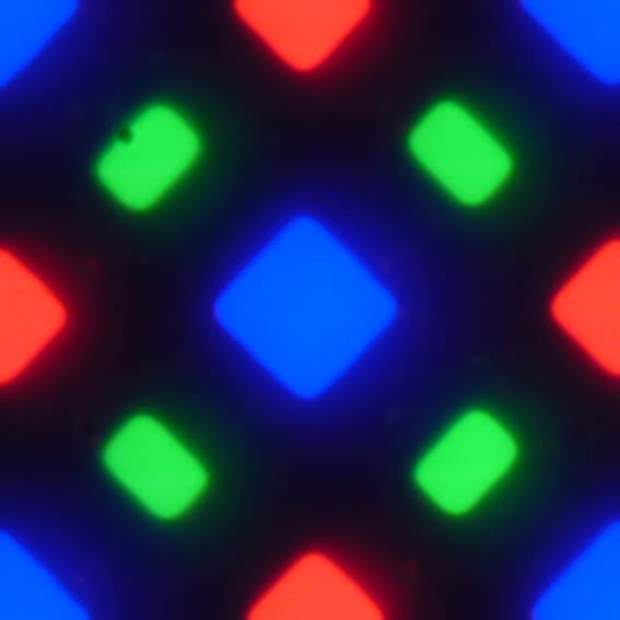 В этом экране используется матрица Super AMOLED — активная матрица на органических светодиодах. Полноцветное изображение создается с помощью субпикселей трех цветов — красного (R), зеленого (G) и синего (B), но красных и синих субпикселей в два раза меньше, что можно обозначить как RGBG. Это подтверждается фрагментом микрофотографии: